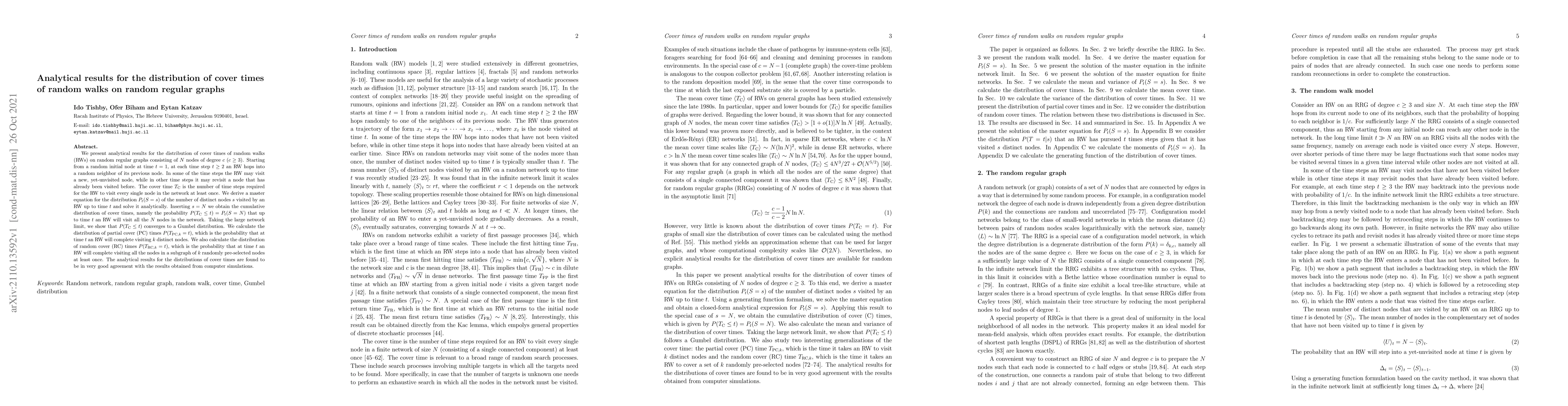 This paper analytically derives the distribution of cover times for random walks on random regular graphs, showing convergence to a Gumbel distribution in the large network limit. It also calculates distributions for partial and random cover times, with results corroborated by computer simulations.
