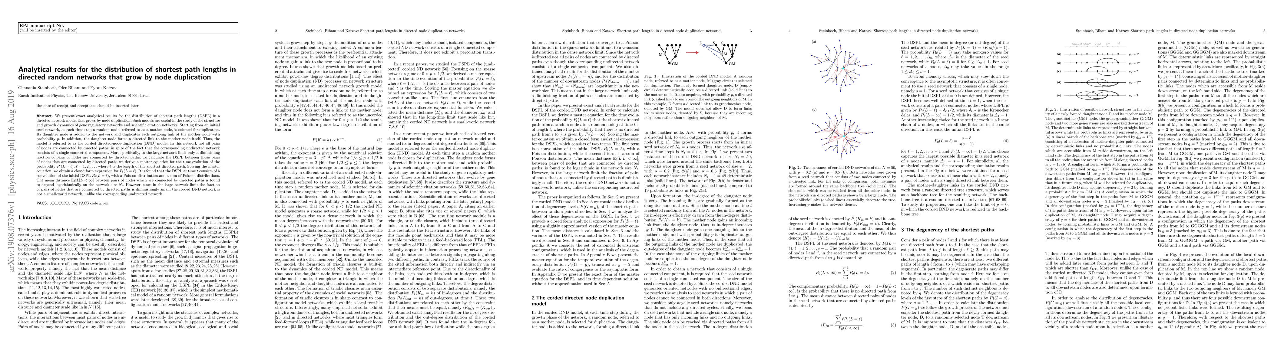A research paper analyzes the distribution of shortest path lengths in a directed random network that grows by node duplication, finding that it consists of a convolution of initial distances with Poisson distributions and depends logarithmically on the network size.