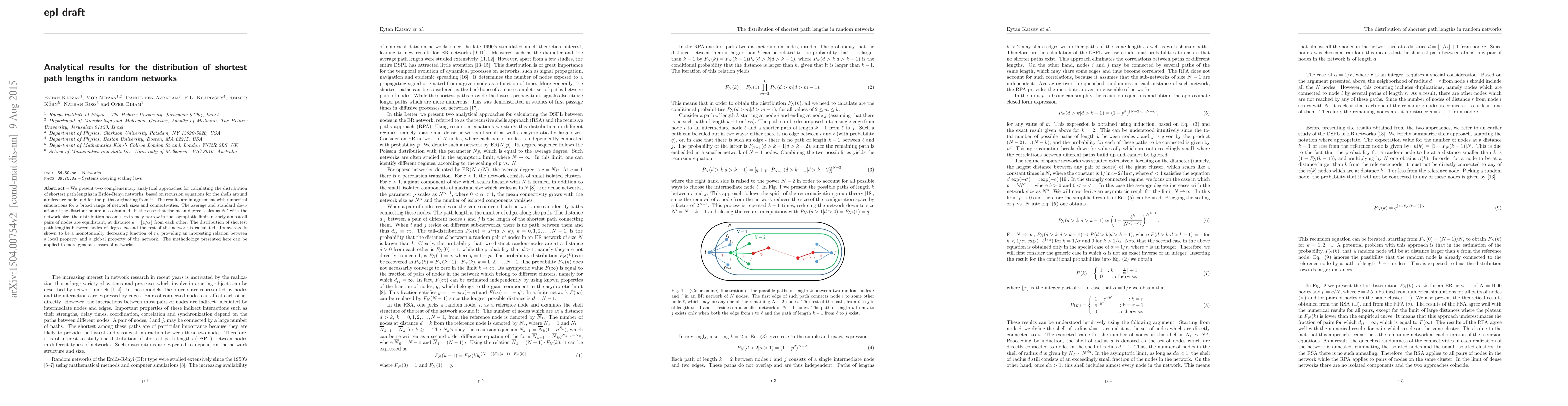 This paper presents two analytical approaches to study the distribution of shortest path lengths in random networks, with key findings including a narrow distribution for well-connected networks and an interesting relation between local and global properties.