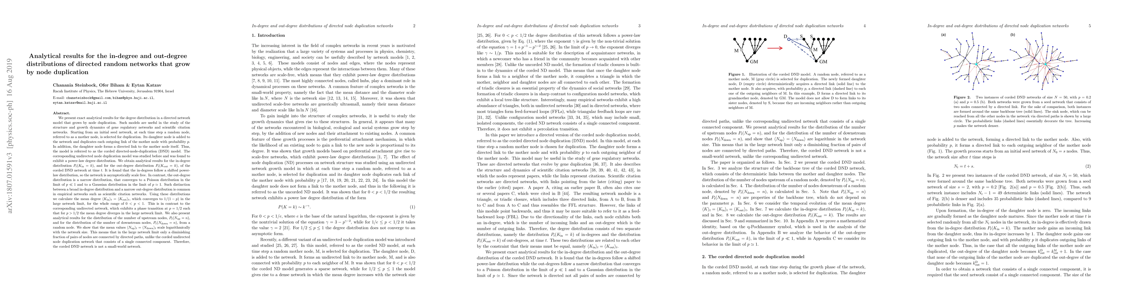 A directed random network model that grows by node duplication shows a shifted power-law in-degree distribution but a narrow out-degree distribution, with the mean degree converging to 1/(1-p) for 0<p<1. This contrasts with undirected models where the mean degree diverges at p=1/2.