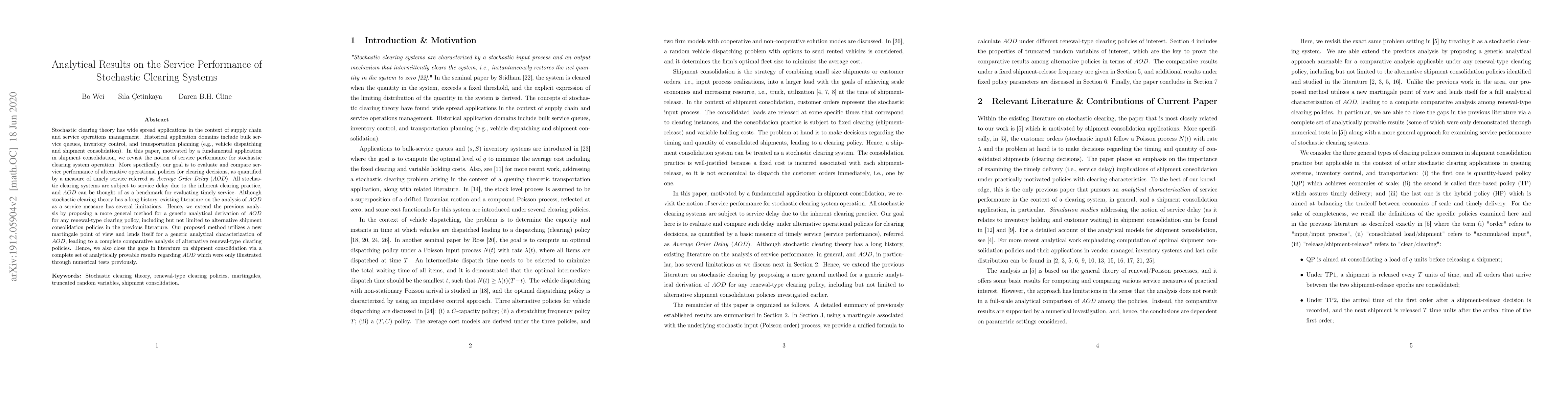 Stochastic clearing theory has wide spread applications in the context of supply chain and service operations management. Historical application domains include bulk service queues, inventory control, and transportation planning (e.g., vehicle dispatching and shipment consolidation). In this paper, motivated by a fundamental application in shipment consolidation, we revisit the notion of service performance for stochastic clearing system operation. More specifically, our goal is to evaluate and compare service performance of alternative operational policies for clearing decisions, as quantified by a measure of timely service referred as \emph{Average Order Delay} ($AOD$). All stochastic clearing systems are subject to service delay due to the inherent clearing practice, and $AOD$ can be thought of as a benchmark for evaluating timely service. Although stochastic clearing theory has a long history, existing literature on the analysis of $AOD$ as a service measure has several limitations. Hence, we extend the previous analysis by proposing a more general method for a generic analytical derivation of $AOD$ for any renewal-type clearing policy, including but not limited to alternative shipment consolidation policies in the previous literature. Our proposed method utilizes a new martingale point of view and lends itself for a generic analytical characterization of $AOD$, leading to a complete comparative analysis of alternative renewal-type clearing policies. Hence, we also close the gaps in literature on shipment consolidation via a complete set of analytically provable results regarding $AOD$ which were only illustrated through numerical tests previously.
