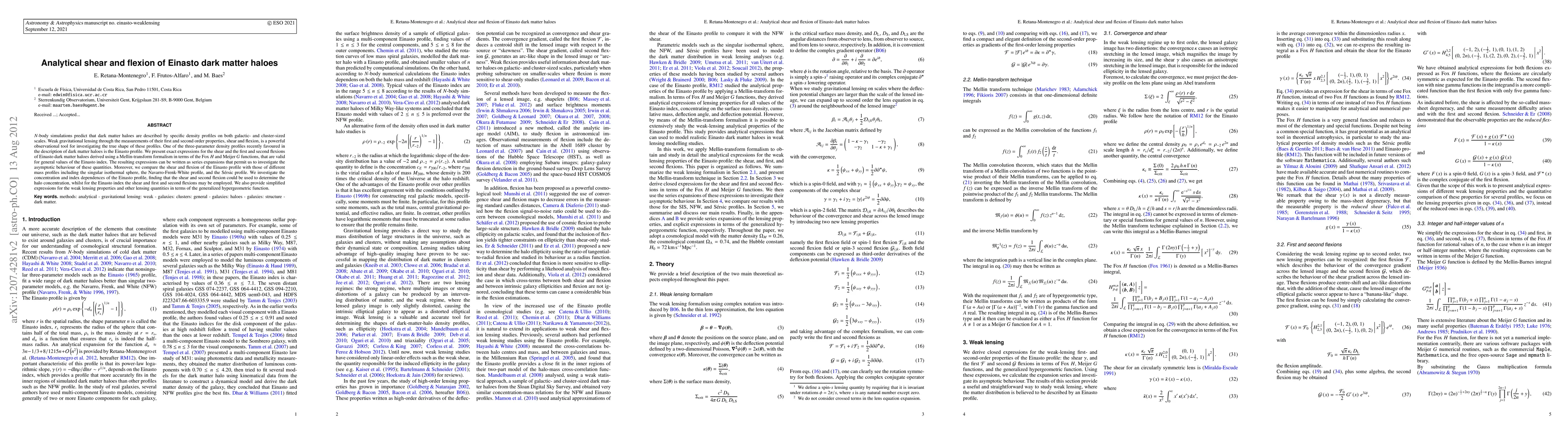 This paper derives exact expressions for the shear and flexion of Einasto dark matter haloes using Mellin-transform formalism, comparing these properties with other mass profiles to determine their utility in characterizing halo concentration and index. The study finds that shear and flexion can be used to infer specific halo properties.