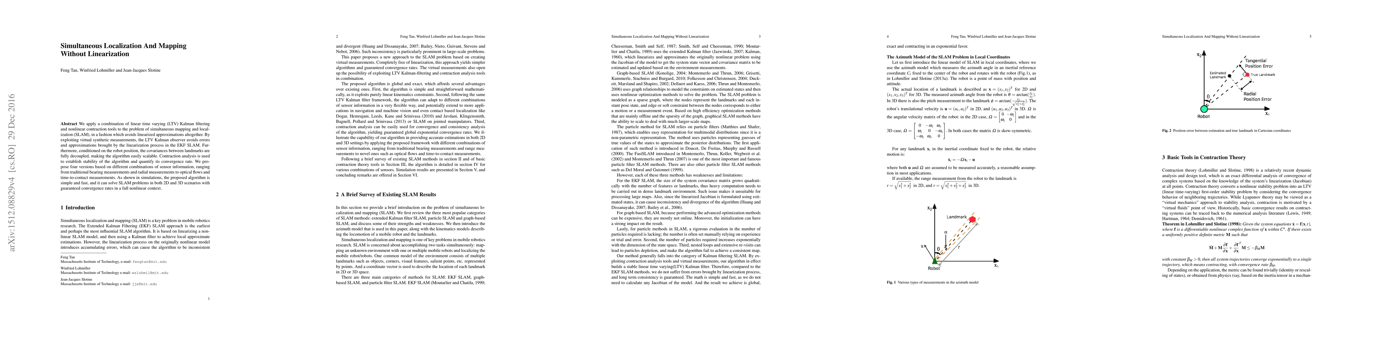 This paper solves the classical problem of simultaneous localization and mapping (SLAM) in a fashion which avoids linearized approximations altogether. Based on creating virtual synthetic measurements, the algorithm uses a linear time- varying (LTV) Kalman observer, bypassing errors and approximations brought by the linearization process in traditional extended Kalman filtering (EKF) SLAM. Convergence rates of the algorithm are established using contraction analysis. Different combinations of sensor information can be exploited, such as bearing measurements, range measurements, optical flow, or time-to-contact. As illustrated in simulations, the proposed algorithm can solve SLAM problems in both 2D and 3D scenarios with guaranteed convergence rates in a full nonlinear context.