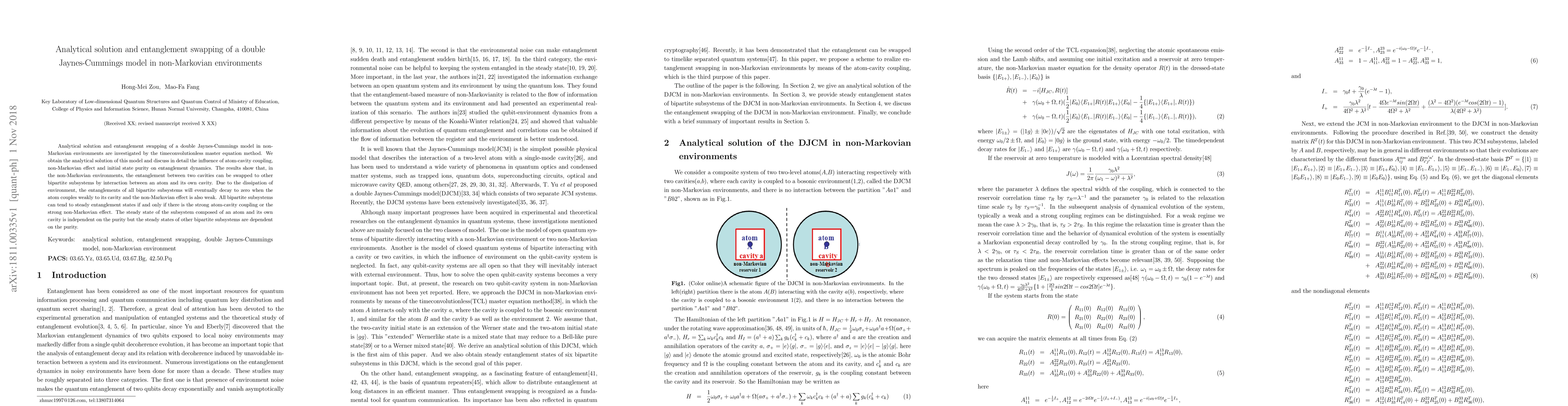This paper investigates the entanglement dynamics in a double Jaynes-Cummings model under non-Markovian environments using the time-convolutionless master equation method. It finds that entanglement swapping can occur, and the presence of strong atom-cavity coupling or a strong non-Markovian effect can lead to steady entanglement states.