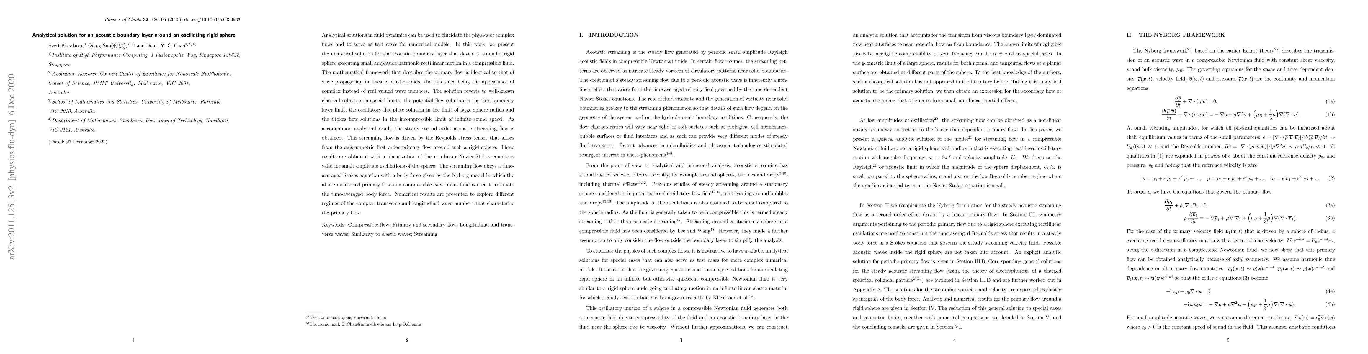 This paper presents an analytical solution for the acoustic boundary layer around a rigid sphere oscillating in a compressible fluid, revealing the underlying physics and serving as a benchmark for numerical models. The solution includes the steady second-order acoustic streaming flow driven by Reynolds stress, validated through numerical results exploring various wave number regimes.