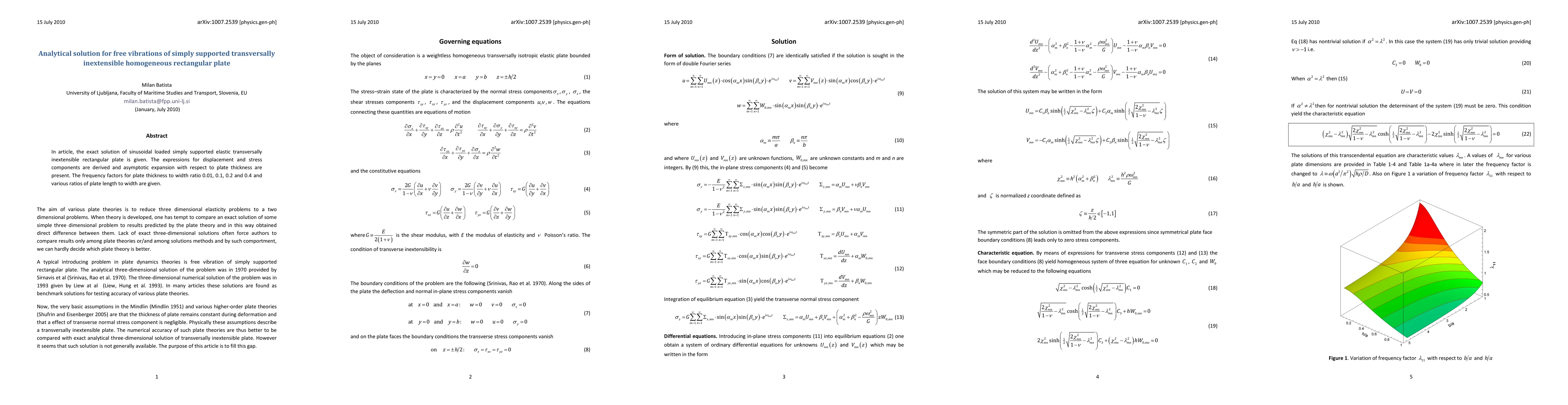 This paper provides an analytical solution for the free vibrations of a simply supported, transversally inextensible rectangular plate, deriving exact expressions for displacement and stress components. It also presents frequency factors for different thickness-to-width ratios and various length-to-width ratios.