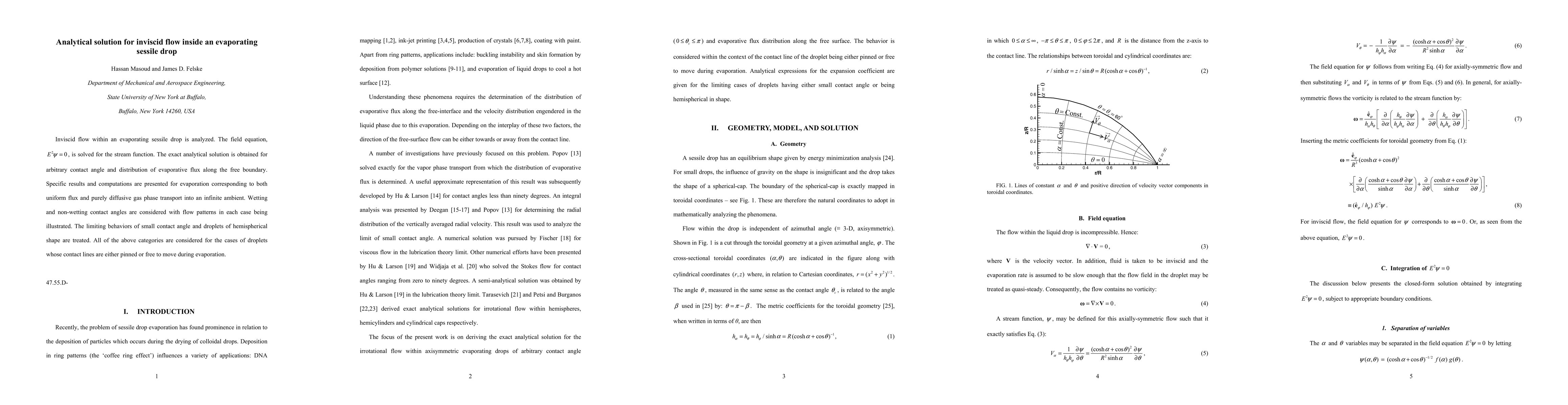 This paper presents an analytical solution for inviscid flow within an evaporating sessile drop, solving the field equation for the stream function. It provides exact solutions for various contact angles and evaporative flux distributions, including uniform flux and diffusive transport scenarios, and discusses flow patterns for both wetting and non-wetting angles, with analyses of pinned and free-moving contact lines.