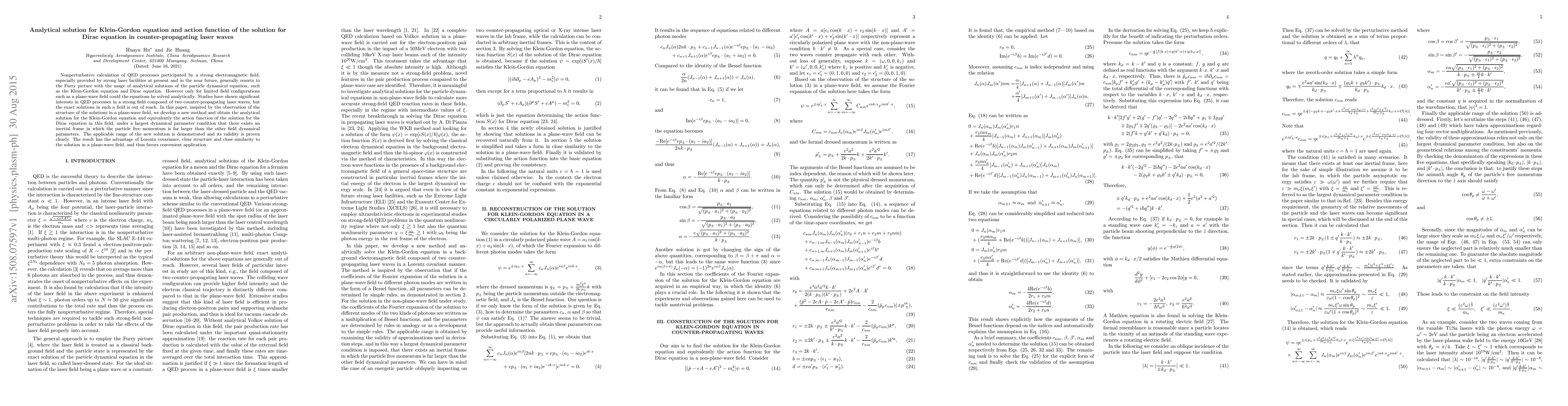Nonperturbative calculation of QED processes participated by a strong electromagnetic field, especially provided by strong laser facilities at present and in the near future, generally resorts to the Furry picture with the usage of analytical solutions of the particle dynamical equation, such as the Klein-Gordon equation and Dirac equation. However only for limited field configurations such as a plane-wave field could the equations be solved analytically. Studies have shown significant interests in QED processes in a strong field composed of two counter-propagating laser waves, but the exact solutions in such a field is out of reach. In this paper, inspired by the observation of the structure of the solutions in a plane-wave field, we develop a new method and obtain the analytical solution for the Klein-Gordon equation and equivalently the action function of the solution for the Dirac equation in this field, under a largest dynamical parameter condition that there exists an inertial frame in which the particle free momentum is far larger than the other field dynamical parameters. The applicable range of the new solution is demonstrated and its validity is proven clearly. The result has the advantage of Lorentz covariance, clear structure and close similarity to the solution in a plane-wave field, and thus favors convenient application.