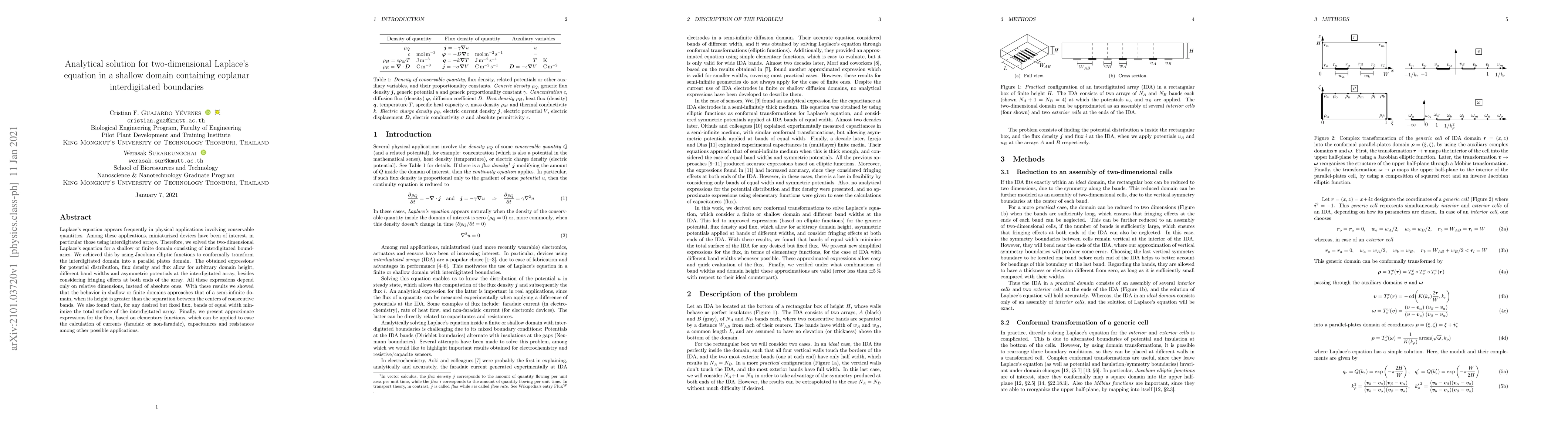 Laplace's equation appears frequently in physical applications involving conservable quantities. Among these applications, miniaturized devices have been of interest, in particular those using interdigitated arrays. Therefore, we solved the two-dimensional Laplace's equation for a shallow or finite domain consisting of interdigitated boundaries. We achieved this by using Jacobian elliptic functions to conformally transform the interdigitated domain into a parallel plates domain. The obtained expressions for potential distribution, flux density and flux allow for arbitrary domain height, different band widths and asymmetric potentials at the interdigitated array, besides considering fringing effects at both ends of the array. All these expressions depend only on relative dimensions, instead of absolute ones. With these results we showed that the behavior in shallow or finite domains approaches that of a semi-infinite domain, when its height is greater than the separation between the centers of consecutive bands. We also found that, for any desired but fixed flux, bands of equal width minimize the total surface of the interdigitated array. Finally, we present approximate expressions for the flux, based on elementary functions, which can be applied to ease the calculation of currents (faradaic or non-faradaic), capacitances and resistances among other possible applications.