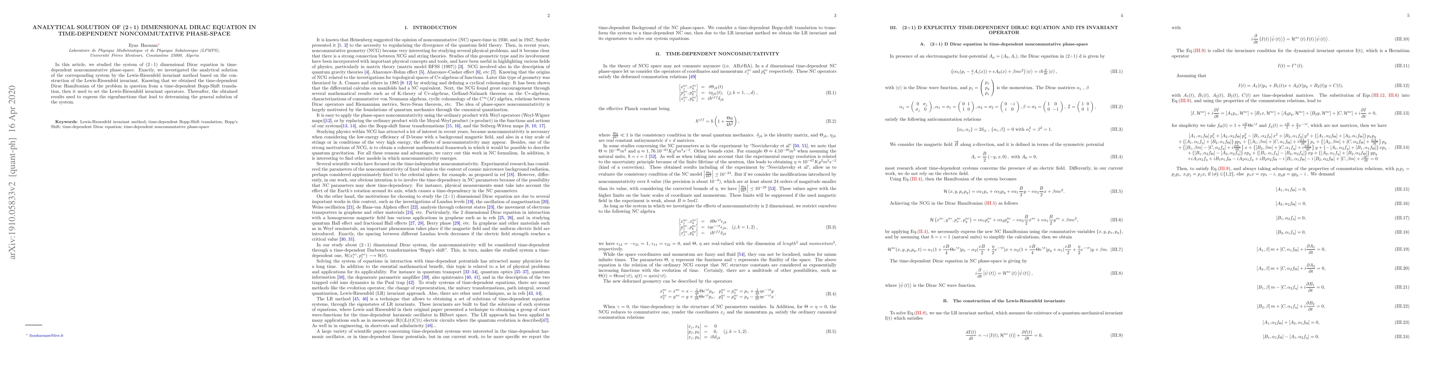 In this article, we studied the system of (2+1) dimensional Dirac equation in time-dependent noncommutative phase-space. Exactly, we investigated the analytical solution of the corresponding system by the Lewis-Riesenfeld invariant method based on the construction of the Lewis-Riesenfeld invariant. Knowing that we obtained the time-dependent Dirac Hamiltonian of the problem in question from a time-dependent Bopp-Shift translation, then it used to set the Lewis-Riesenfeld invariant operators. Thereafter, the obtained results used to express the eigenfunctions that lead to determining the general solution of the system.