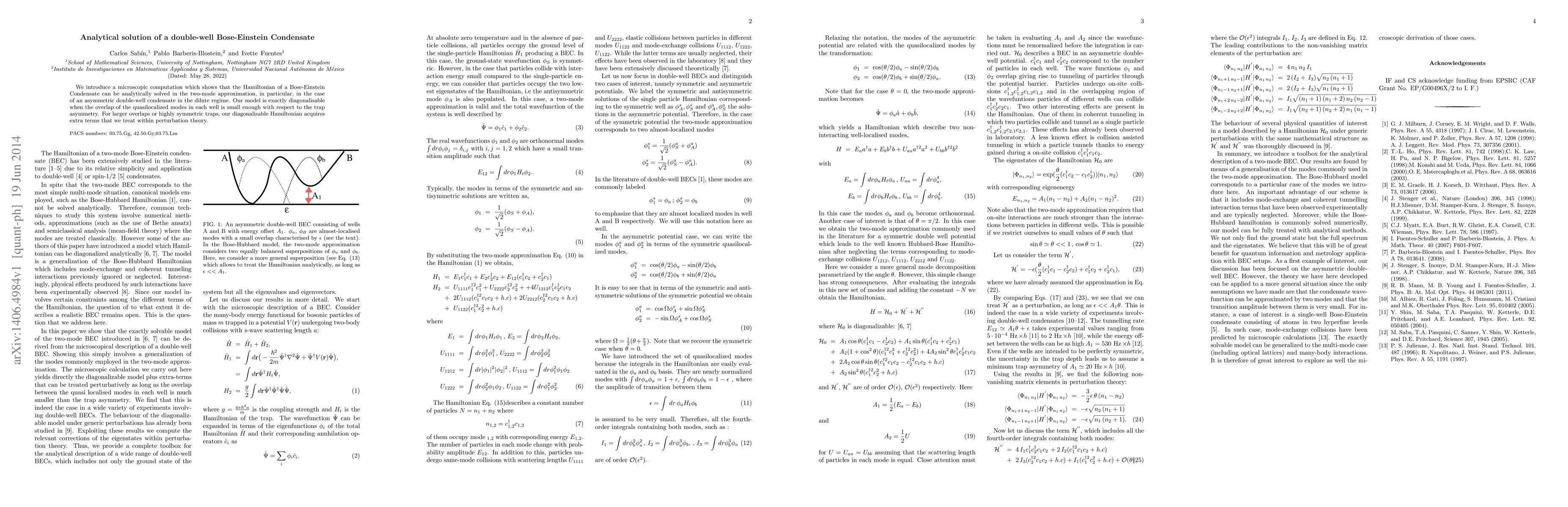We introduce a microscopic computation which shows that the Hamiltonian of a Bose-Einstein Condensate can be analytically solved in the two-mode approximation, in particular, in the case of an asymmetric double-well condensate in the dilute regime. Our model is exactly diagonalisable when the overlap of the quasilocalized modes in each well is small enough with respect to the trap asymmetry. For larger overlaps or highly symmetric traps, our diagonalisable Hamiltonian acquires extra terms that we treat within perturbation theory.