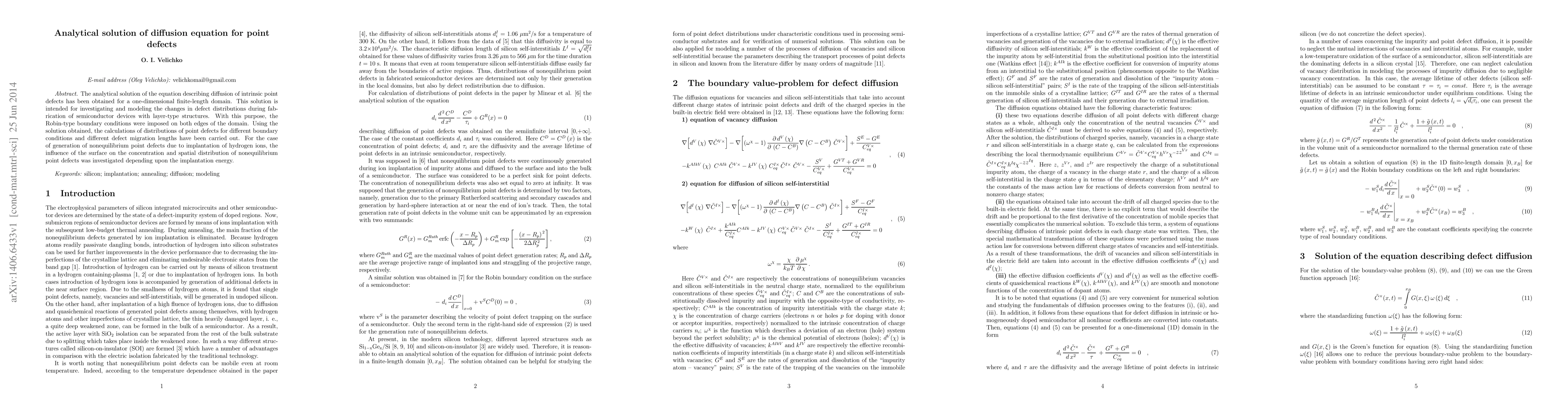 The analytical solution of the equation describing diffusion of intrinsic point defects has been obtained for a one-dimensional finite-length domain. This solution is intended for investigating and modeling the changes in defect distributions during fabrication of semiconductor devices with layer-type structures. With this purpose, the Robin-type boundary conditions were imposed on both edges of the domain. Using the solution obtained, the calculations of distributions of point defects for different boundary conditions and different defect migration lengths have been carried out. For the case of generation of nonequilibrium point defects due to implantation of hydrogen ions, the influence of the surface on the concentration and spatial distribution of nonequilibrium point defects was investigated depending upon the implantation energy.