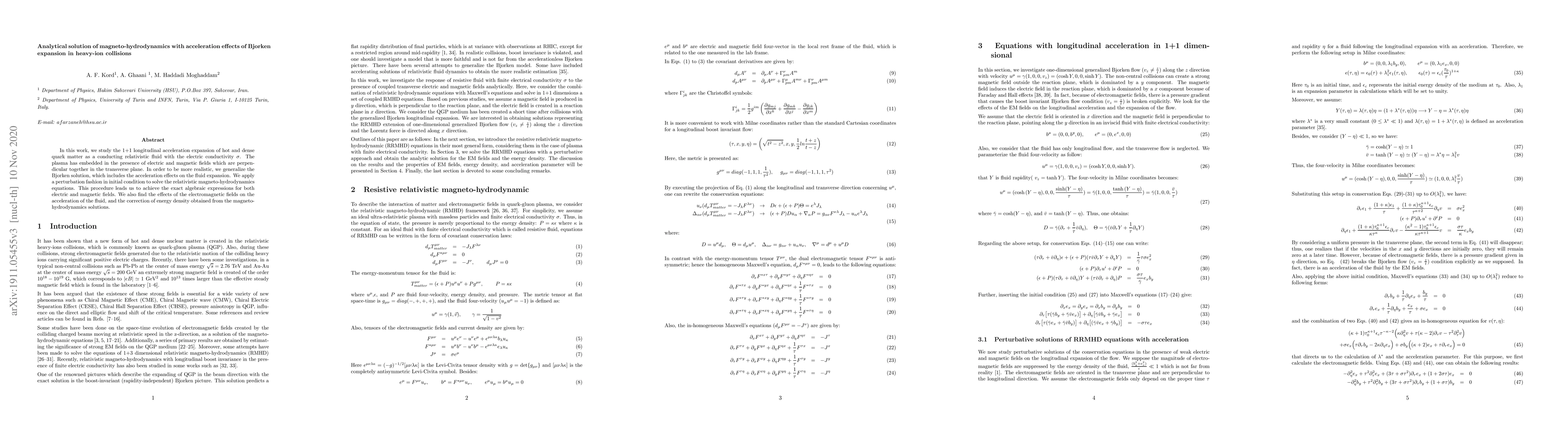 In this work, we study the 1+1 longitudinal acceleration expansion of hot and dense quark matter as a conducting relativistic fluid with the electric conductivity $\sigma$. The plasma has embedded in the presence of electric and magnetic fields which are perpendicular together in the transverse plane. In order to be more realistic, we generalize the Bjorken solution, which includes the acceleration effects on the fluid expansion. We apply a perturbation fashion in initial condition to solve the relativistic magneto-hydrodynamics equations. This procedure leads us to achieve the exact algebraic expressions for both electric and magnetic fields. We also find the effects of the electromagnetic fields on the acceleration of the fluid, and the correction of energy density obtained from the magneto-hydrodynamics solutions.