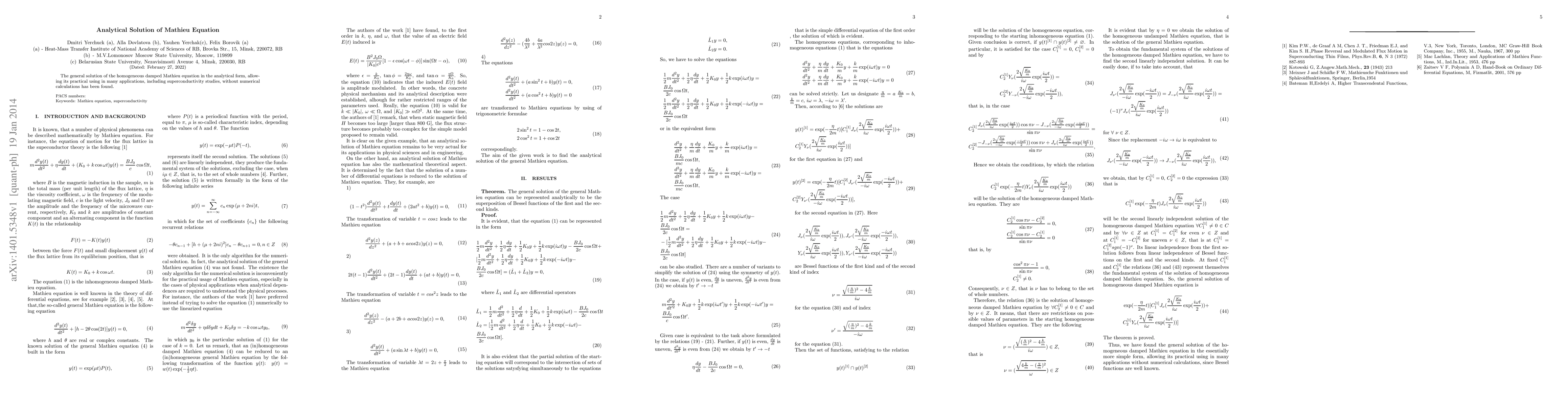 The general solution of the homogeneous damped Mathieu equation in the analytical form, allowing its practical using in many applications, including superconductivity studies, without numerical calculations has been found.