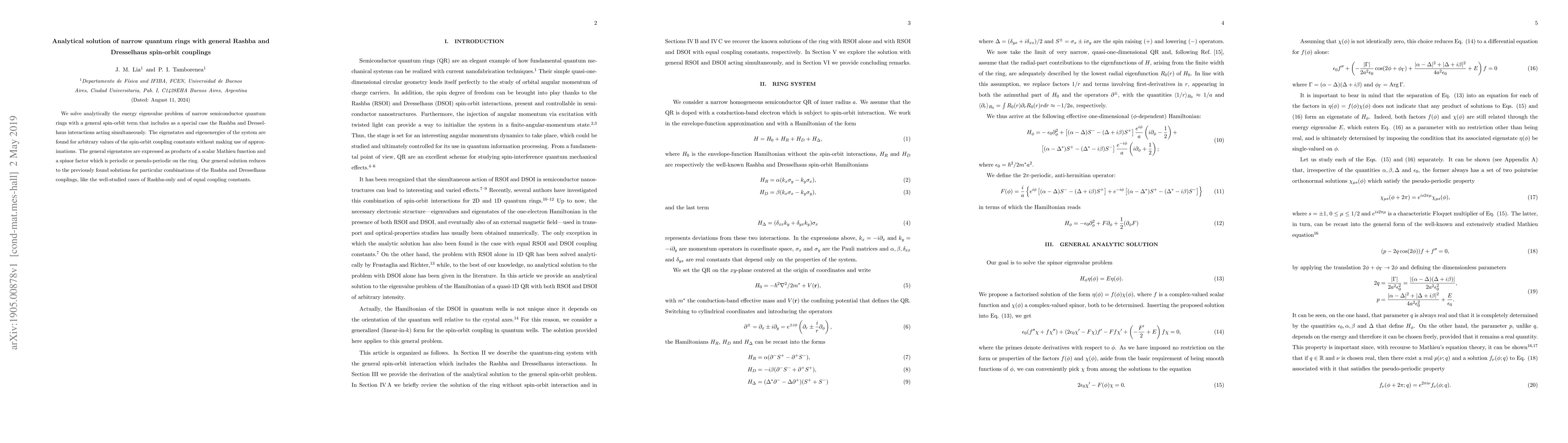 We solve analytically the energy eigenvalue problem of narrow semiconductor quantum rings with a general spin-orbit term that includes as a special case the Rashba and Dresselhaus interactions acting simultaneously. The eigenstates and eigenenergies of the system are found for arbitrary values of the spin-orbit coupling constants without making use of approximations. The general eigenstates are expressed as products of a scalar Mathieu function and a spinor factor which is periodic or pseudo-periodic on the ring. Our general solution reduces to the previously found solutions for particular combinations of the Rashba and Dresselhaus couplings, like the well-studied cases of Rashba-only and of equal coupling constants.