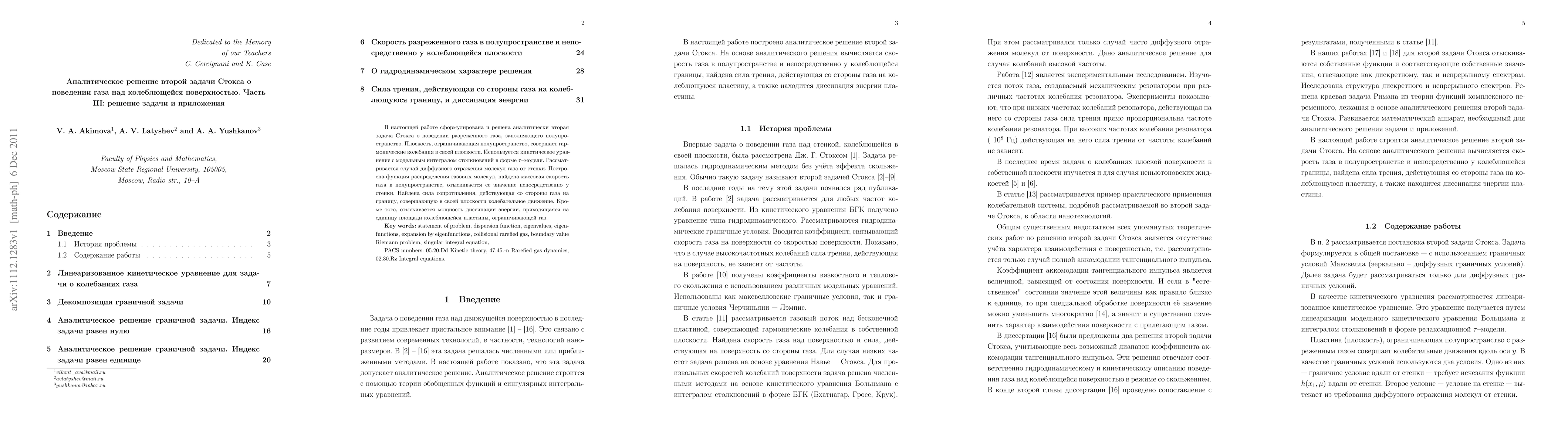 This paper presents an analytical solution for the second Stokes problem concerning the behavior of rarefied gas over an oscillating surface. It utilizes the kinetic equation with a $\tau$-model and explores both continuous and discrete eigen solutions, leading to precise calculations of gas velocity, friction force, and energy dissipation.