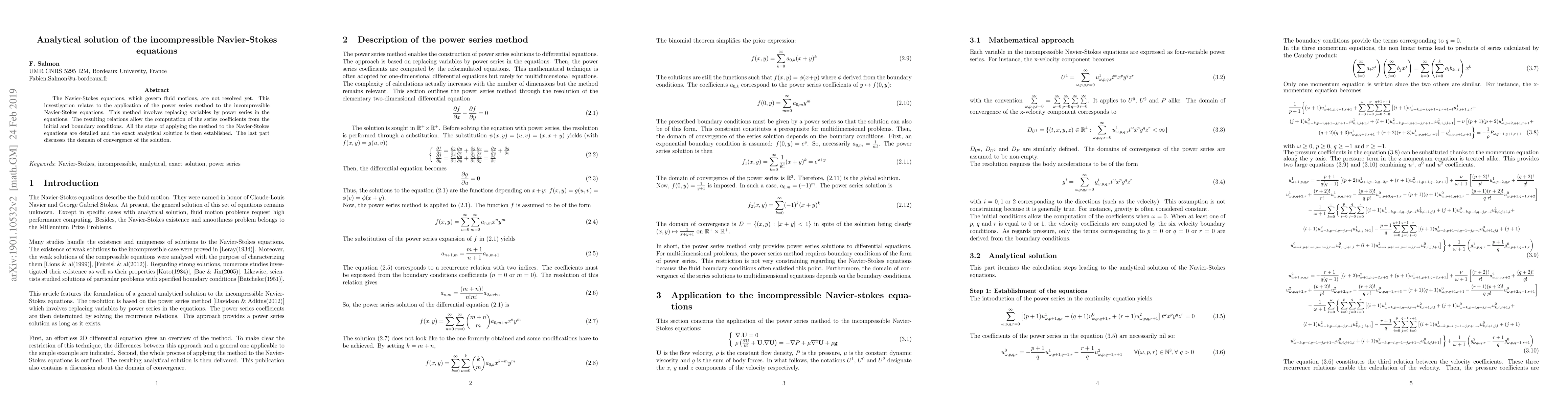 This paper presents an analytical solution for the incompressible Navier-Stokes equations using the power series method, detailing the computation of series coefficients from initial and boundary conditions, and discusses the domain of convergence of the solution.