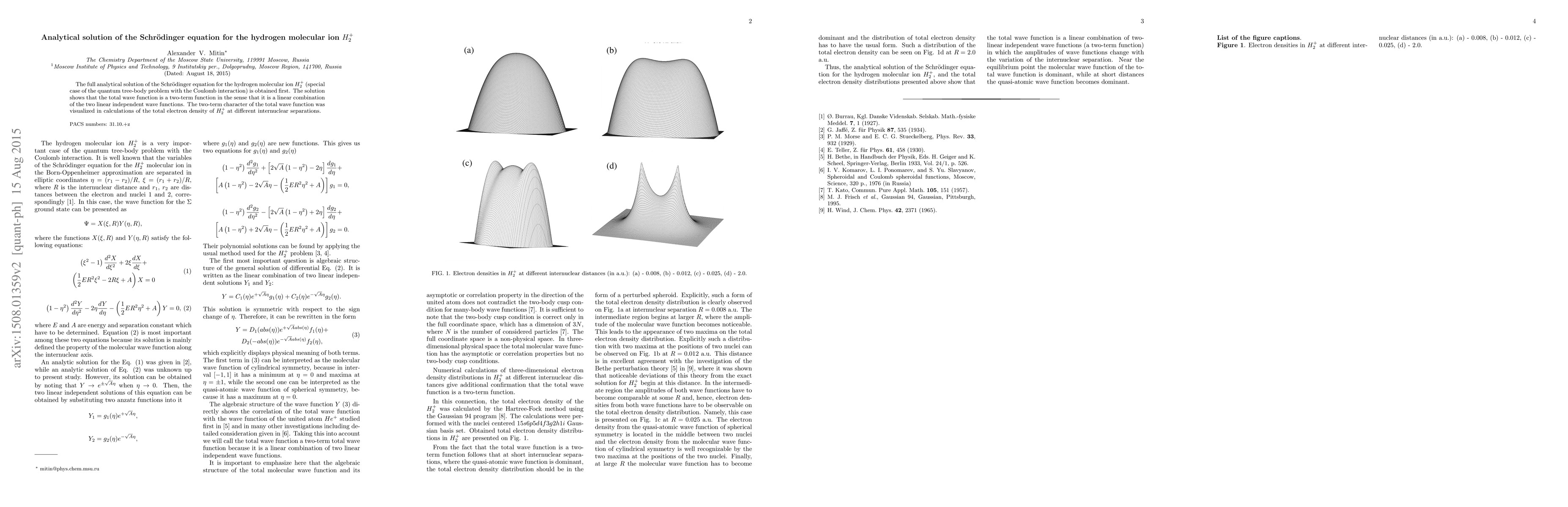 This paper presents the full analytical solution of the Schrödinger equation for the hydrogen molecular ion $H_2^+$, revealing a two-term total wave function composed of two linearly independent wave functions. Visualizations of the total electron density at various internuclear separations confirm the two-term nature of the solution.