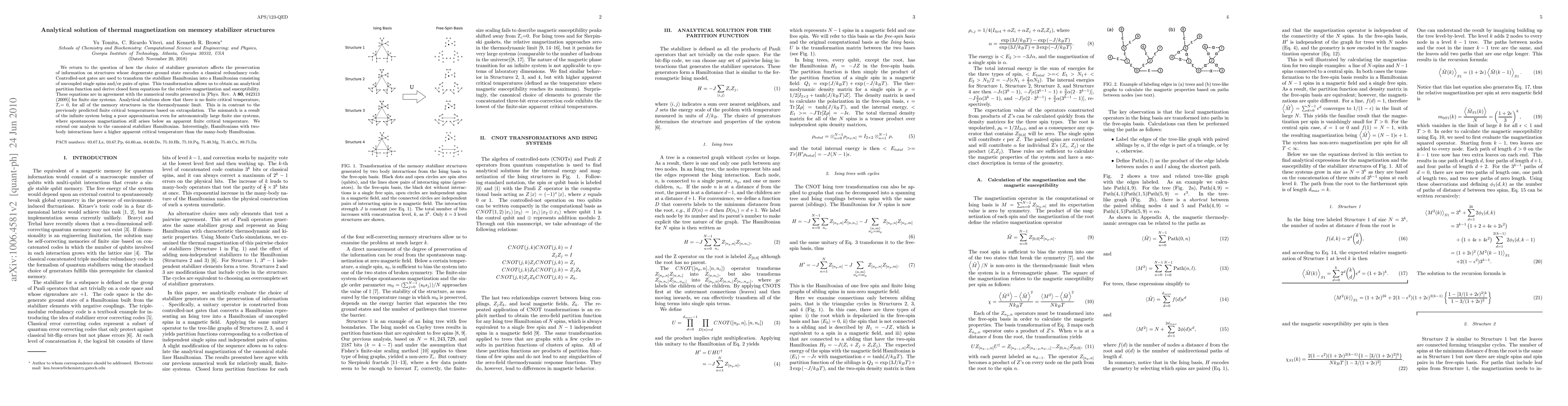 We return to the question of how the choice of stabilizer generators affects the preservation of information on structures whose degenerate ground state encodes a classical redundancy code. Controlled-not gates are used to transform the stabilizer Hamiltonian into a Hamiltonian consisting of uncoupled single spins and/or pairs of spins. This transformation allows us to obtain an analytical partition function and derive closed form equations for the relative magnetization and susceptibility. These equations are in agreement with the numerical results presented in [arXiv:0907.0394v1] for finite size systems. Analytical solutions show that there is no finite critical temperature, Tc=0, for all of the memory structures in the thermodynamic limit. This is in contrast to the previously predicted finite critical temperatures based on extrapolation. The mismatch is a result of the infinite system being a poor approximation even for astronomically large finite size systems, where spontaneous magnetization still arises below an apparent finite critical temperature. We extend our analysis to the canonical stabilizer Hamiltonian. Interestingly, Hamiltonians with two-body interactions have a higher apparent critical temperature than the many-body Hamiltonian.