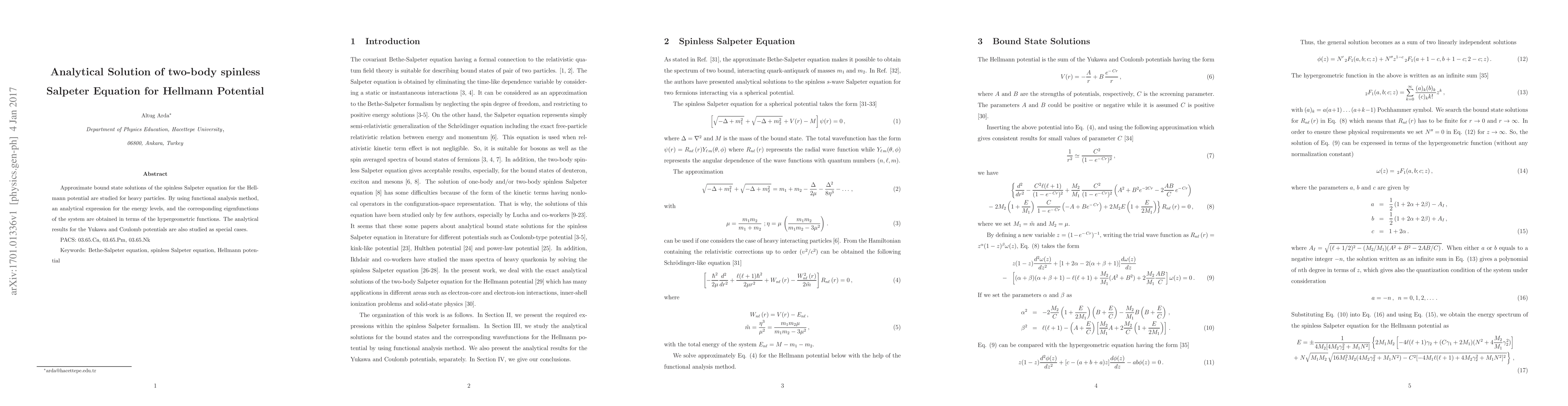 This paper provides an analytical solution for the spinless Salpeter equation under the Hellmann potential, deriving exact expressions for energy levels and eigenfunctions using functional analysis and hypergeometric functions. Special cases for the Yukawa and Coulomb potentials are also examined.