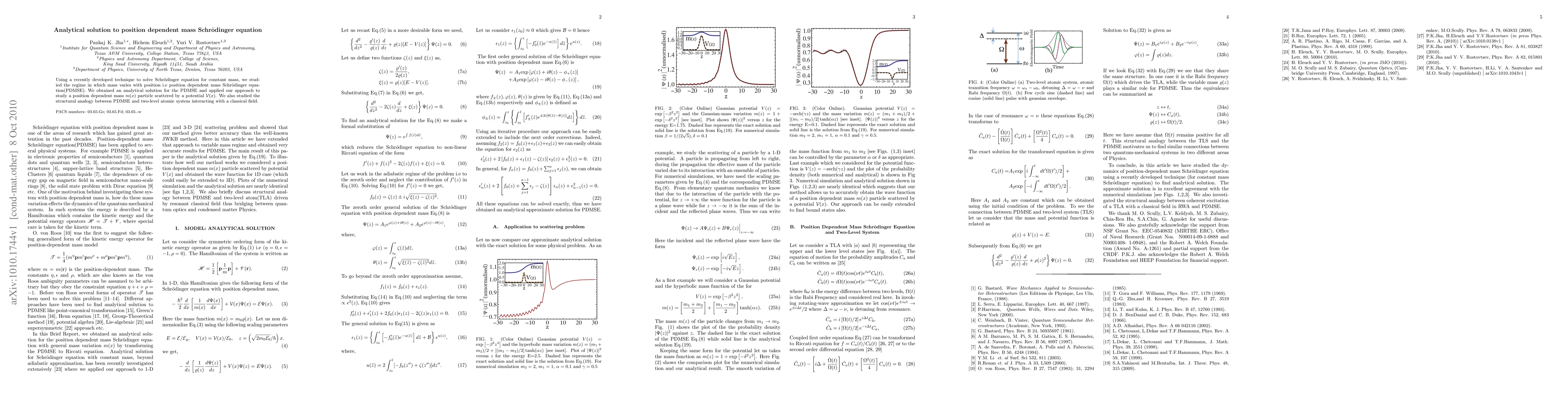Using a recently developed technique to solve Schr\"odinger equation for constant mass, we studied the regime in which mass varies with position i.e position dependent mass Schr\"odinger equation(PDMSE). We obtained an analytical solution for the PDMSE and applied our approach to study a position dependent mass $m(x)$ particle scattered by a potential $\mathcal{V}(x)$. We also studied the structural analogy between PDMSE and two-level atomic system interacting with a classical field.