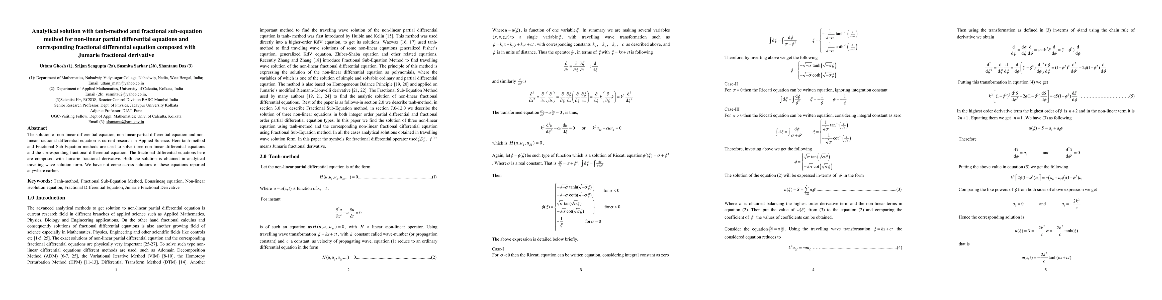 This paper presents analytical solutions for non-linear differential, partial differential, and fractional differential equations using the tanh-method and Fractional Sub-Equation method. The fractional differential equations incorporate Jumarie fractional derivatives, yielding novel analytical traveling wave solutions not previously reported.