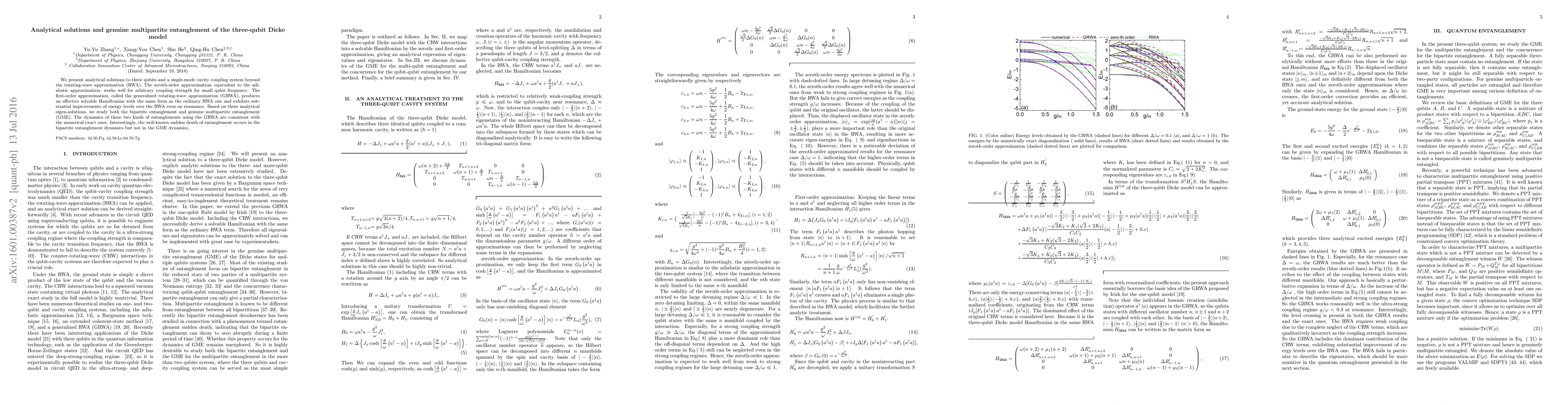 We present analytical solutions to three qubits and a single-mode cavity coupling system beyond the rotating-wave approximation (RWA). The zero-th order approximation gives correct solutions when the qubits are far detuned from the cavity. The first order approximation, called generalized rotating-wave approximation (GRWA), produces an effective solvable Hamiltonian with the same form as the ordinary RWA one and exhibits substantial improvements of energy levels over the RWA even on resonance. Based on these analytical eigen-solutions, we study both the bipartite entanglement and genuine multipartite entanglement (GME). The dynamics of the concurrence and the GME using the GRWA are in consistent with the numerical ones. Interestingly, the well known sudden death of entanglement occurs in the bipartite entanglement dynamics but not in GME dynamics.