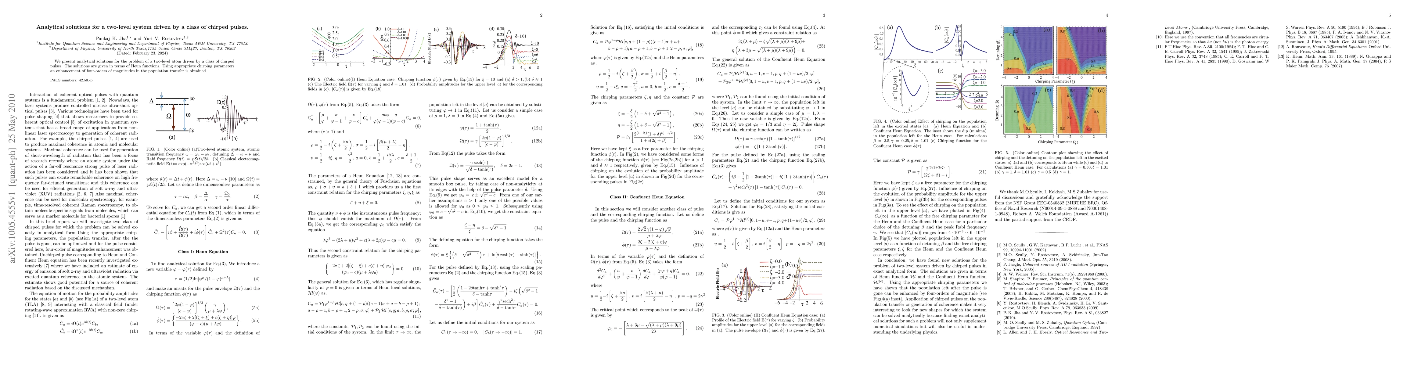 This paper provides analytical solutions for a two-level system influenced by chirped pulses, expressed via Heun functions, and demonstrates a significant four-order-of-magnitude improvement in population transfer through optimal chirping parameters.
