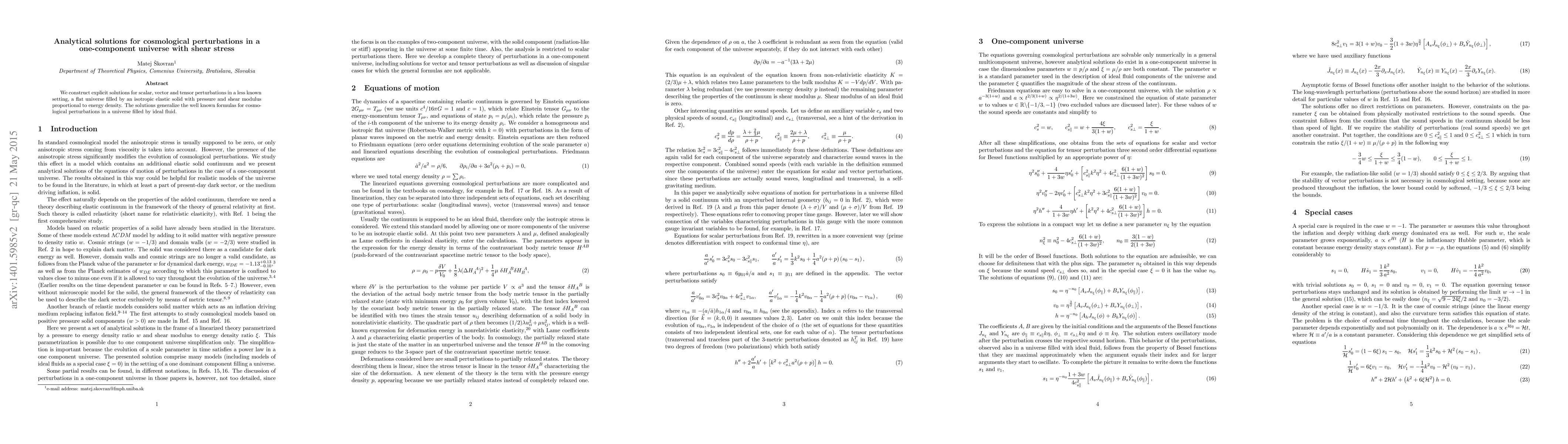 We construct explicit solutions for scalar, vector and tensor perturbations in a less known setting, a flat universe filled by an isotropic elastic solid with pressure and shear modulus proportional to energy density. The solutions generalize the well known formulas for cosmological perturbations in a universe filled by ideal fluid.