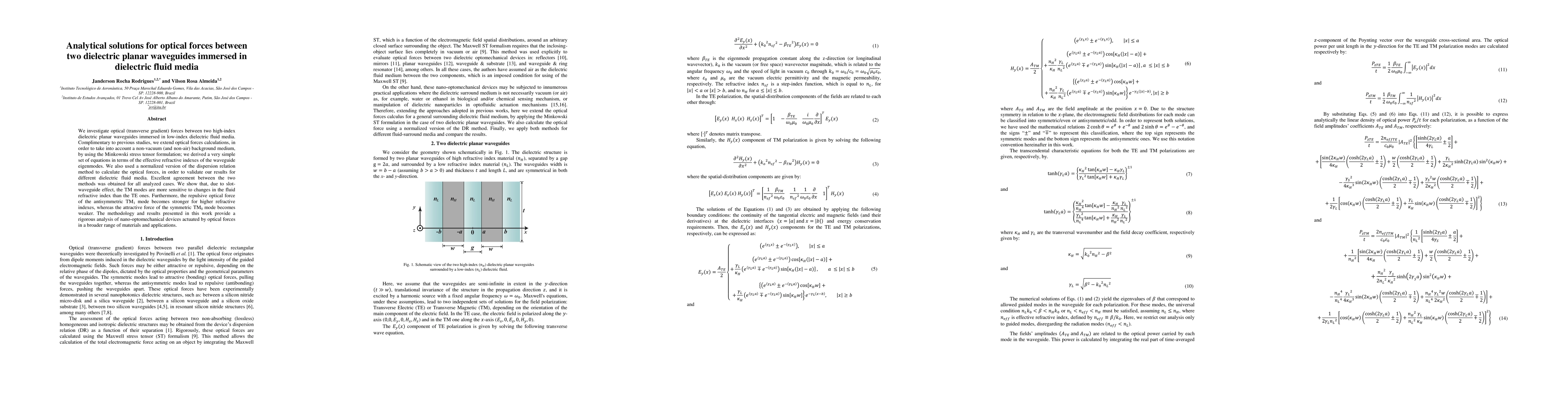 This paper presents analytical solutions for optical forces between two dielectric planar waveguides in fluid media, using the Minkowski stress tensor and dispersion relation methods. The study reveals that TM modes are more sensitive to fluid refractive index changes, with the antisymmetric TM1 mode showing a stronger repulsive force at higher refractive indexes.