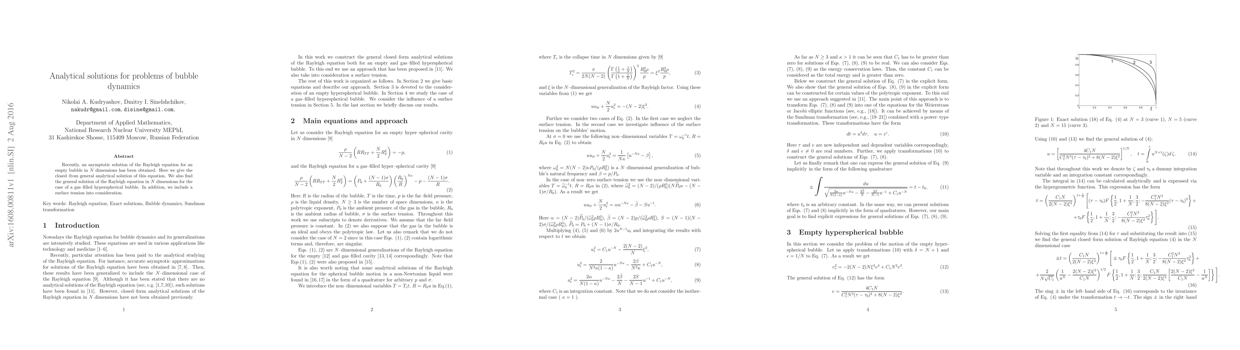 Recently, an asymptotic solution of the Rayleigh equation for an empty bubble in $N$ dimensions has been obtained. Here we give the closed--from general analytical solution of this equation. We also find the general solution of the Rayleigh equation in $N$ dimensions for the case of a gas--filled hyperspherical bubble. In addition, we include a surface tension into consideration.
