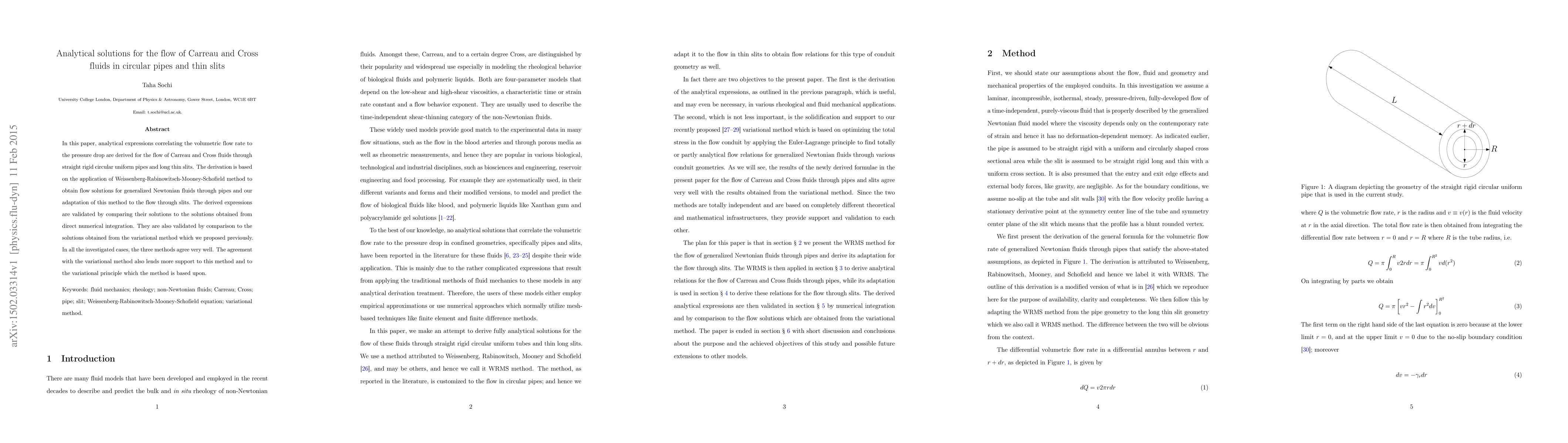 This paper derives analytical solutions for the volumetric flow rate versus pressure drop for Carreau and Cross fluids in circular pipes and thin slits using the Weissenberg-Rabinowitsch-Mooney-Schofield method. The derived expressions are validated against both numerical integration and a previously proposed variational method, showing strong agreement across all methods.