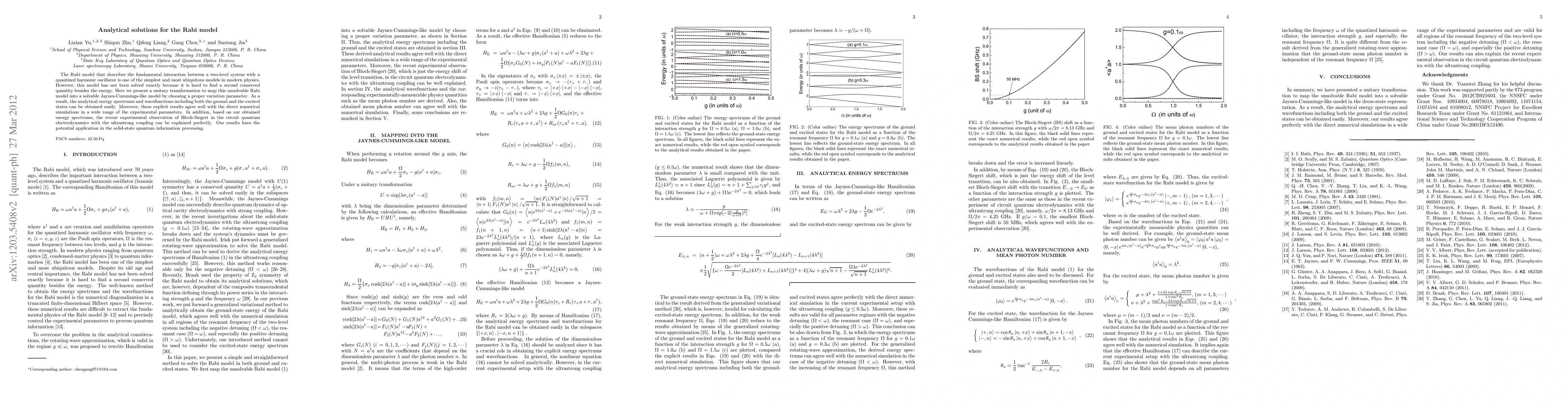 The paper presents an analytical solution for the Rabi model by mapping it to a solvable Jaynes-Cummings-like model using a unitary transformation, obtaining exact energy spectra and wavefunctions that match numerical simulations and explain recent experimental observations in ultrastrong coupling regimes. This method has potential applications in quantum information processing.
