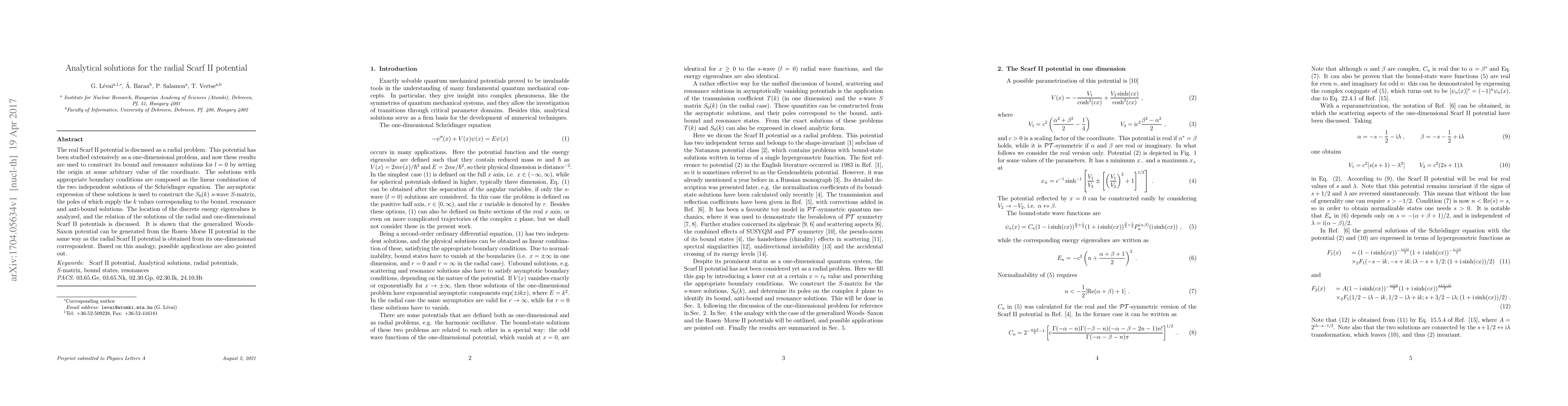 Researchers develop analytical solutions for the radial Scarf II potential, showing its relation to a generalized Woods-Saxon potential and pointing out possible applications based on analogy with one-dimensional counterparts.