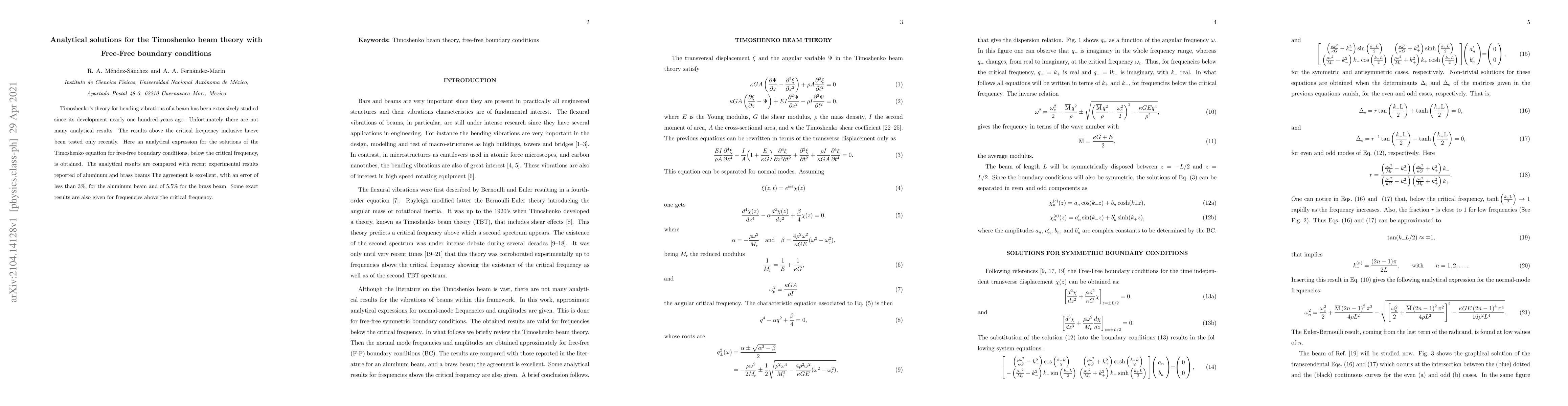 Timoshenko's theory for bending vibrations of a beam has been extensively studied since its development nearly one hundred years ago. Unfortunately there are not many analytical results. The results above the critical frequency inclusive haeve been tested only recently. Here an analytical expression for the solutions of the Timoshenko equation for free-free boundary conditions, below the critical frequency, is obtained. The analytical results are compared with recent experimental results reported of aluminum and brass beams The agreement is excellent, with an error of less than 3%, for the aluminum beam and of 5.5% for the brass beam. Some exact results are also given for frequencies above the critical frequency.
