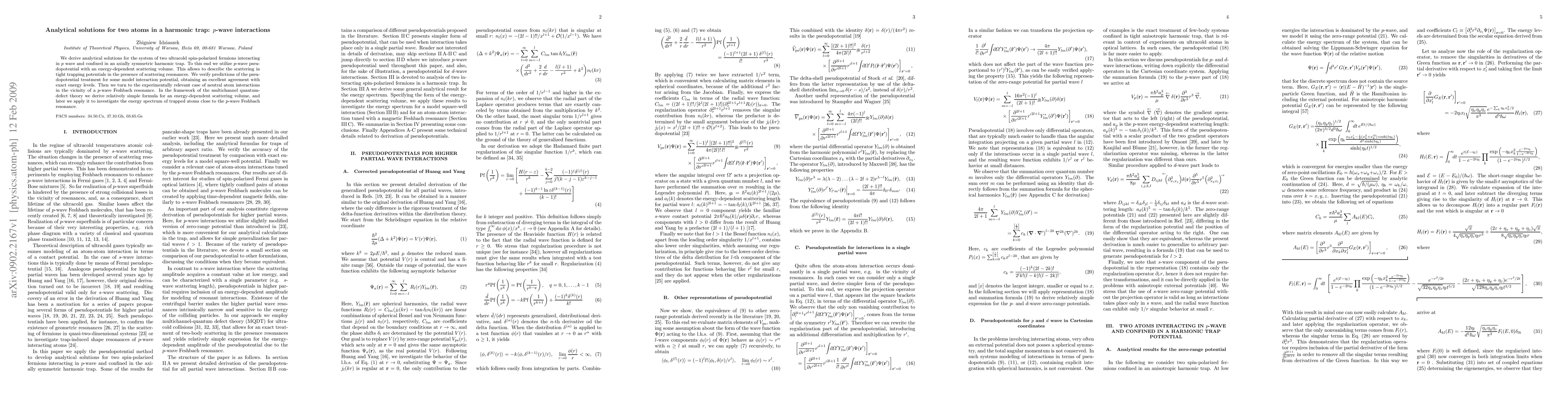 We derive analytical solutions for the system of two ultracold spin-polarized fermions interacting in p wave and confined in an axially symmetric harmonic trap. To this end we utilize p-wave pseudopotential with an energy-dependent scattering volume. This allows to describe the scattering in tight trapping potentials in the presence of scattering resonances. We verify predictions of the pseudopotential treatment for some model interaction potential, obtaining an excellent agreement with exact energy levels. Then we turn to the experimentally relevant case of neutral atom interactions in the vicinity of a p-wave Feshbach resonance. In the framework of the multichannel quantum-defect theory we derive relatively simple formula for an energy-dependent scattering volume, and later we apply it to investigate the energy spectrum of trapped atoms close to the p-wave Feshbach resonance.