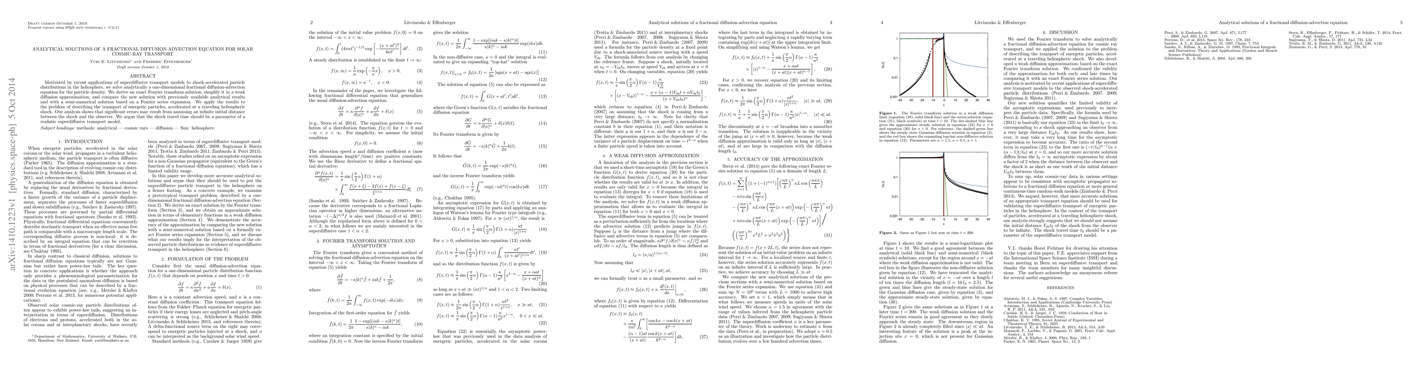 This paper analytically solves a fractional diffusion-advection equation for solar cosmic-ray transport, deriving an exact Fourier transform solution and comparing it with previous results and semi-numerical solutions. The analysis highlights the importance of shock travel time in superdiffusive transport models to avoid significant errors.