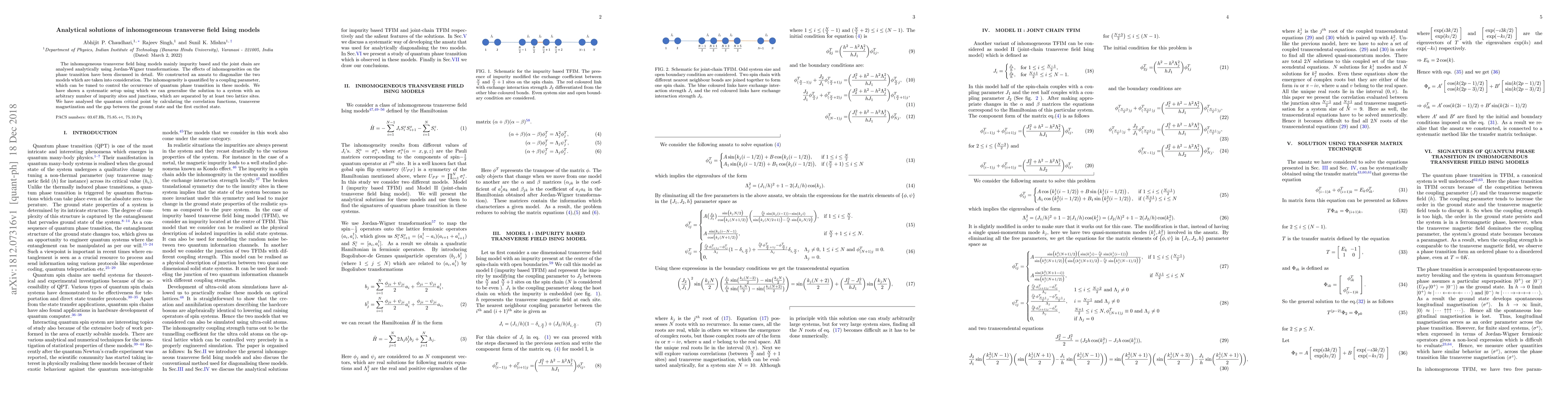 The inhomogeneous transverse field Ising models mainly impurity based and the joint chain are analysed analytically using Jordan-Wigner transformations. The effects of inhomogeneities on the phase transition have been discussed in detail. We constructed an ansatz to diagonalize the two models which are taken into consideration. The inhomogeneity is quantified by a coupling parameter, which can be tuned to control the occurrence of quantum phase transition in these models. We have shown a systematic setup using which we can generalise the solution to a system with an arbitrary number of impurity sites and junctions, which are separated by at least two lattice sites. We have analysed the quantum critical point by calculating the correlation functions, transverse magnetization and the gap between the ground state and the first excited state.