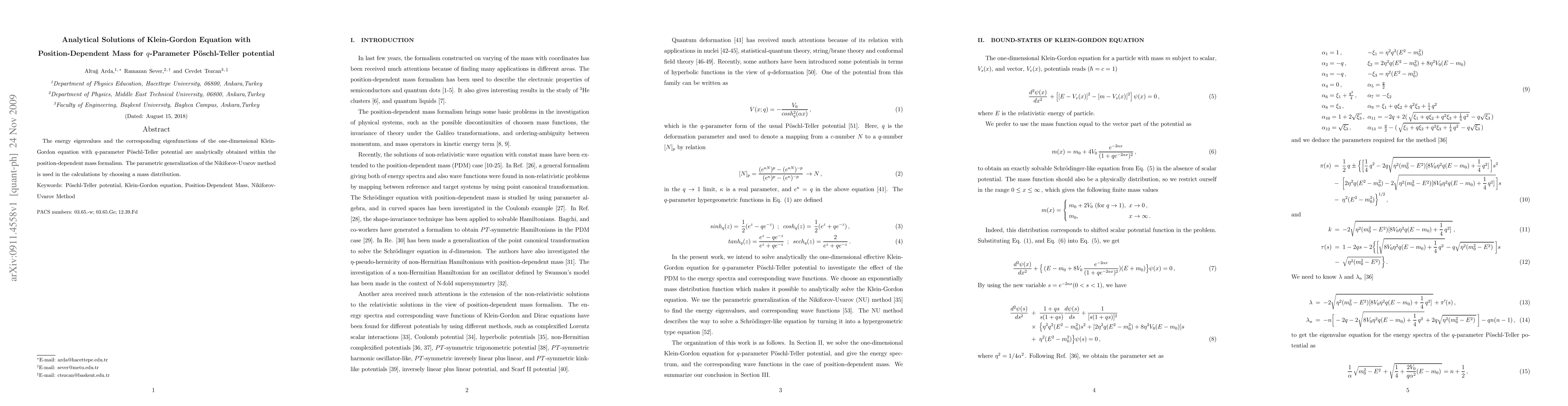 This paper analytically determines the energy eigenvalues and eigenfunctions of the Klein-Gordon equation for a q-parameter Poschl-Teller potential using the position-dependent mass formalism. The parametric generalization of the Nikiforov-Uvarov method is employed to solve the equation.