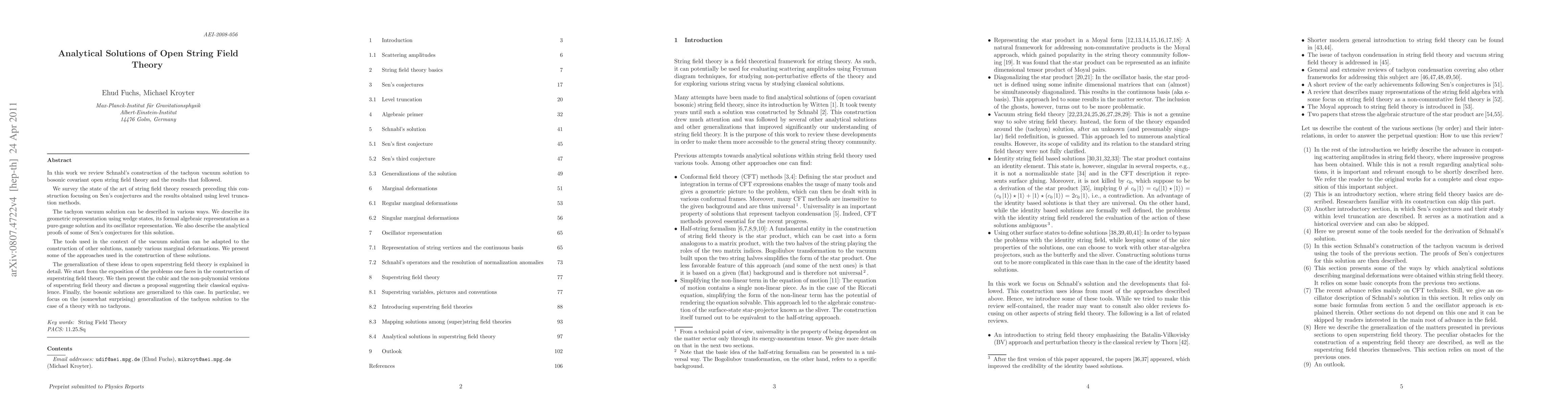 In this work we review Schnabl's construction of the tachyon vacuum solution to bosonic covariant open string field theory and the results that followed. We survey the state of the art of string field theory research preceding this construction focusing on Sen's conjectures and the results obtained using level truncation methods. The tachyon vacuum solution can be described in various ways. We describe its geometric representation using wedge states, its formal algebraic representation as a pure-gauge solution and its oscillator representation. We also describe the analytical proofs of some of Sen's conjectures for this solution. The tools used in the context of the vacuum solution can be adapted to the construction of other solutions, namely various marginal deformations. We present some of the approaches used in the construction of these solutions. The generalization of these ideas to open superstring field theory is explained in detail. We start from the exposition of the problems one faces in the construction of superstring field theory. We then present the cubic and the non-polynomial versions of superstring field theory and discuss a proposal suggesting their classical equivalence. Finally, the bosonic solutions are generalized to this case. In particular, we focus on the (somewhat surprising) generalization of the tachyon solution to the case of a theory with no tachyons.