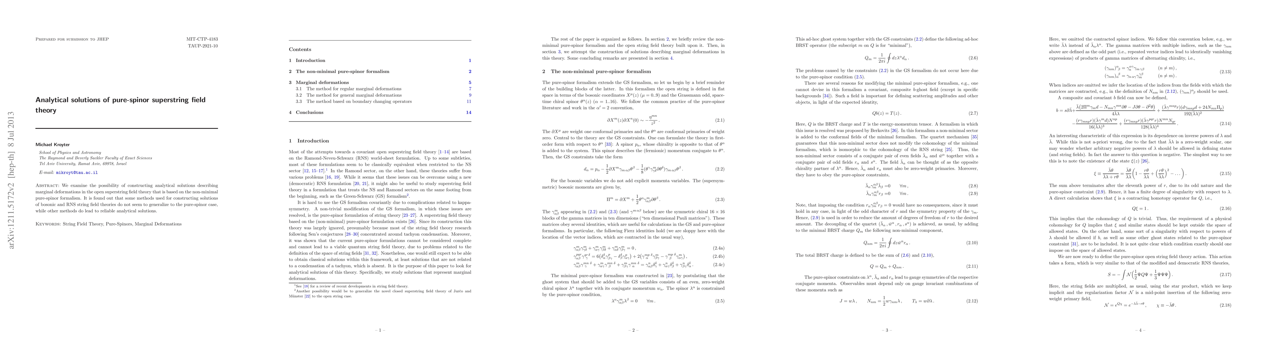 This paper explores analytical solutions for marginal deformations in open superstring field theory using the non-minimal pure-spinor formalism. While some methods from bosonic and RNS string field theories fail to generalize, others successfully yield reliable analytical solutions.
