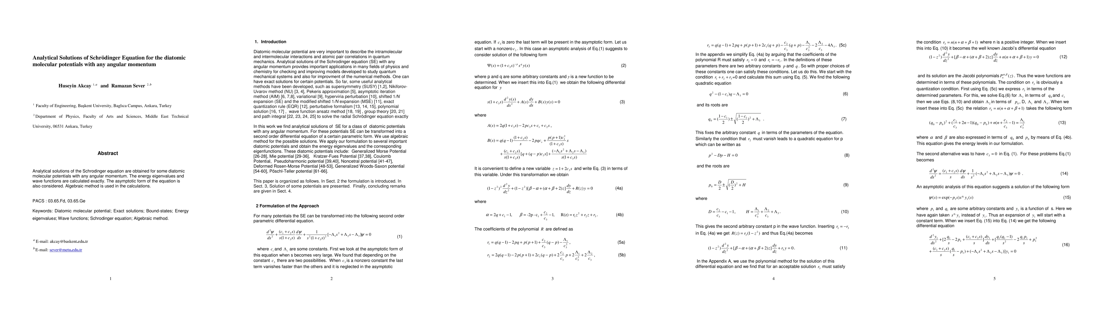 This paper presents analytical solutions for the Schrödinger equation applied to diatomic molecular potentials, considering any angular momentum. Exact energy eigenvalues and wave functions are derived using an algebraic method, with attention to the asymptotic behavior of the solutions.