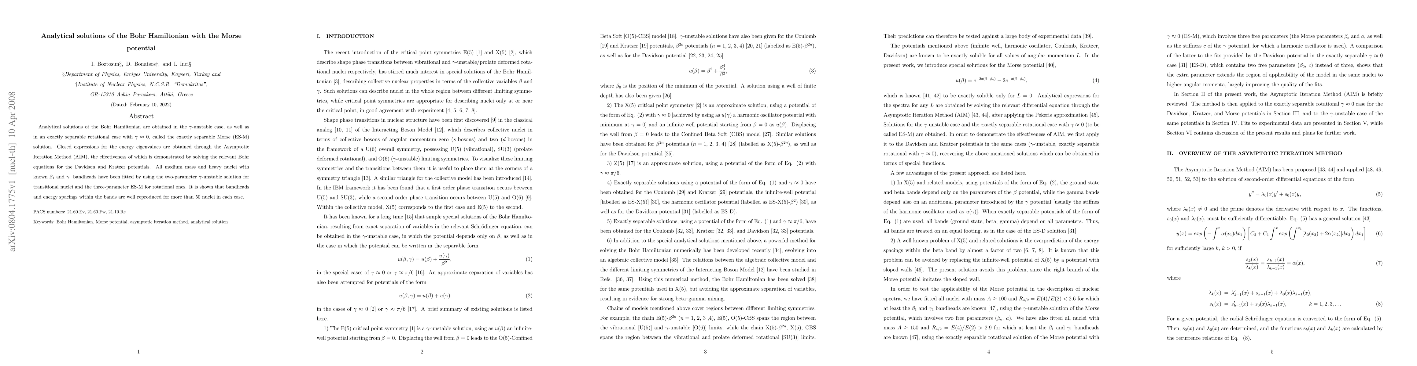 This paper presents analytical solutions for the Bohr Hamiltonian with the Morse potential, specifically addressing the $\gamma$-unstable case and an exactly separable rotational case. The Asymptotic Iteration Method (AIM) is used to derive closed expressions for energy eigenvalues, which are validated through fitting known bandheads for over 50 medium mass and heavy nuclei.