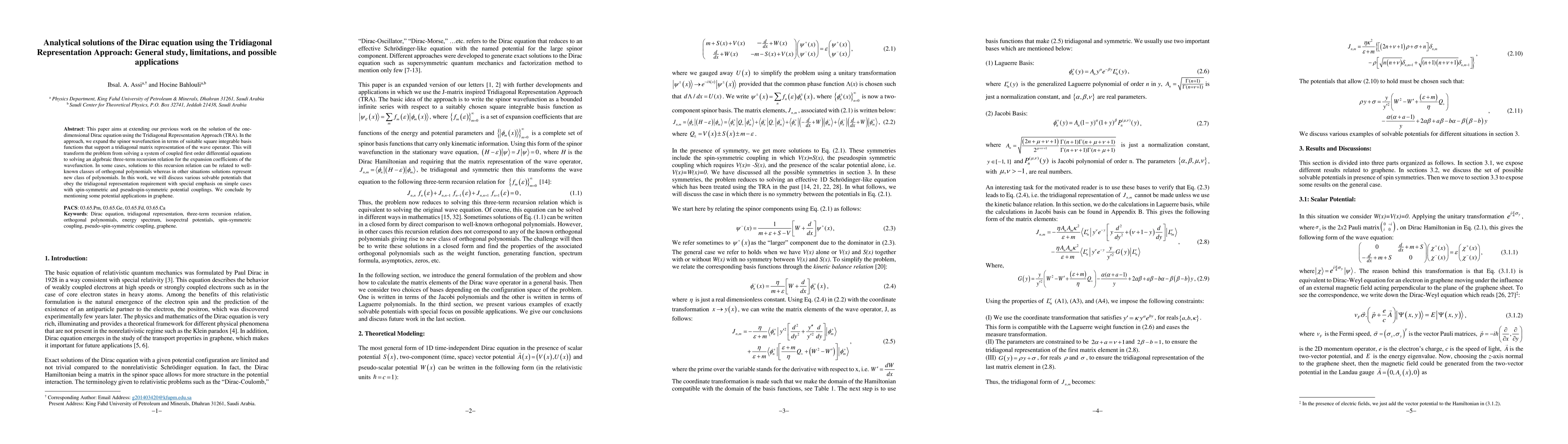 This paper aims at extending our previous work on the solution of the one-dimensional Dirac equation using the Tridiagonal Representation Approach (TRA). In the approach, we expand the spinor wavefunction in terms of suitable square integrable basis functions that support a tridiagonal matrix representation of the wave operator. This will transform the problem from solving a system of coupled first order differential equations to solving an algebraic three-term recursion relation for the expansion coefficients of the wavefunction. In some cases, solutions to this recursion relation can be related to well-known classes of orthogonal polynomials whereas in other situations solutions represent new class of polynomials. In this work, we will discuss various solvable potentials that obey the tridiagonal representation requirement with special emphasis on simple cases with spin-symmetric and pseudospin-symmetric potential couplings. We conclude by mentioning some potential applications in graphene.