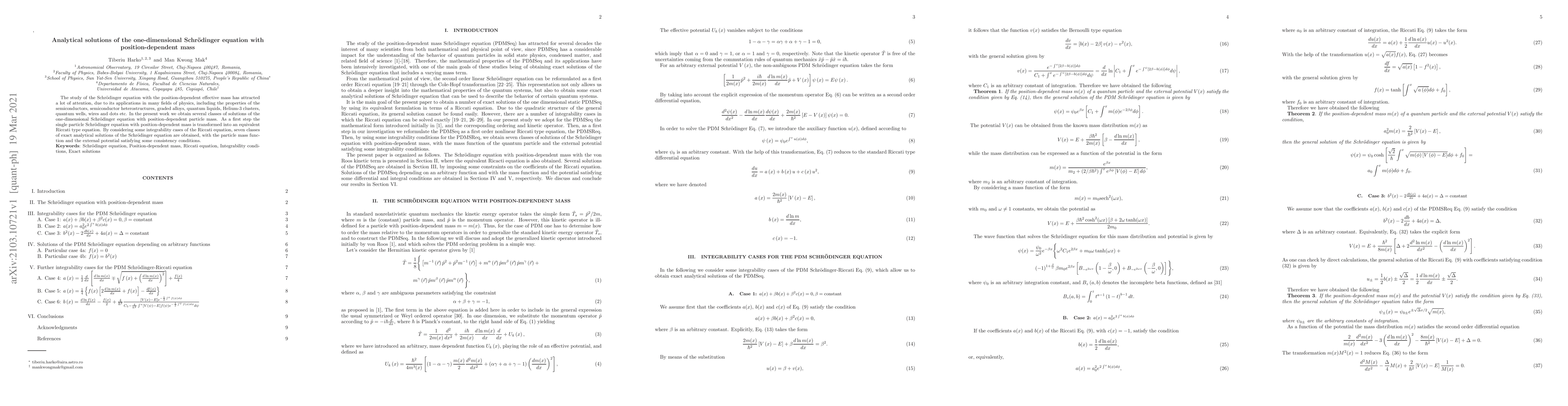 The paper derives analytical solutions for the one-dimensional Schrödinger equation with position-dependent mass, transforming it into a Riccati equation. Seven classes of exact analytical solutions are obtained under specific consistency conditions for the particle mass function and external potential.