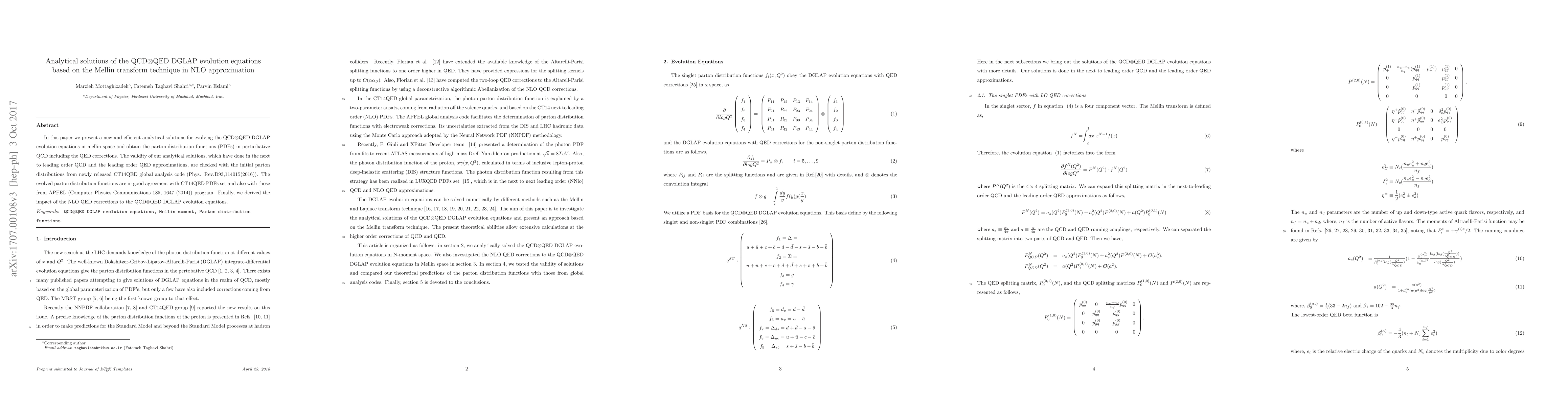 This paper develops analytical solutions for the QCD⊗QED DGLAP evolution equations using the Mellin transform technique at next-to-leading order (NLO) in QCD and leading order (LO) in QED. The solutions yield parton distribution functions (PDFs) that align well with the CT14QED global analysis and APFEL program results.