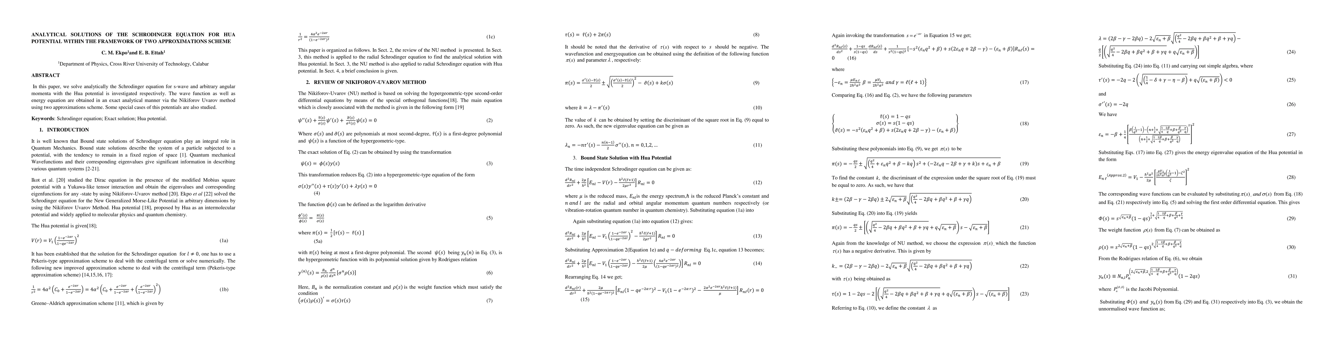 This paper provides exact analytical solutions for the Schrödinger equation with the Hua potential, focusing on s-wave and arbitrary angular momenta. The solutions are derived using the Nikiforov-Uvarov method within two approximation schemes, and special cases of the potential are examined.