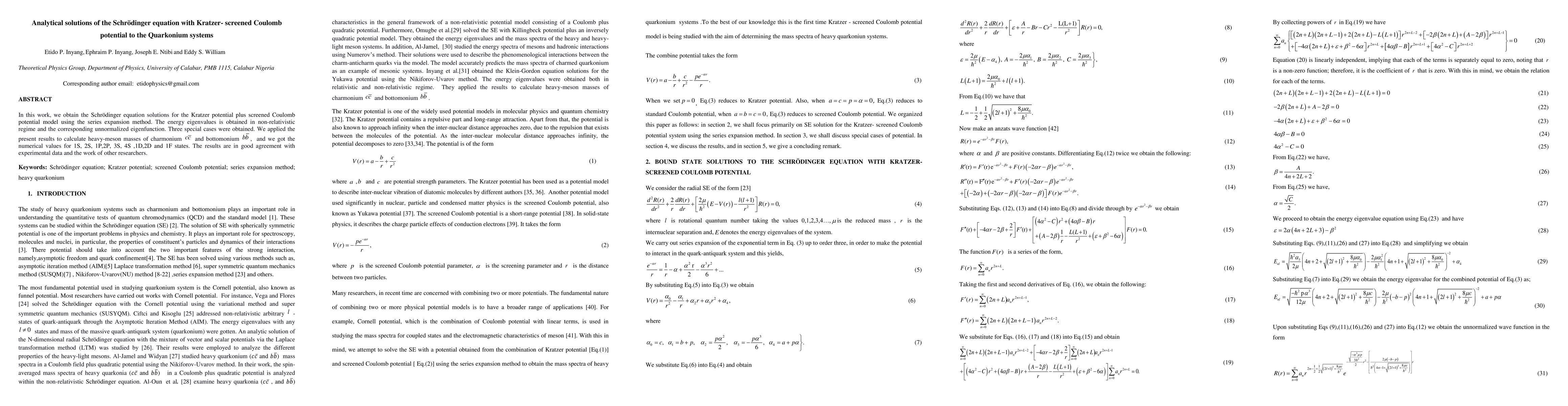 This paper provides analytical solutions for the Schrödinger equation with a Kratzer-screened Coulomb potential in quarkonium systems using series expansion. The study yields energy eigenvalues for various charmonium and bottomonium states, showing good agreement with experimental data and previous research.