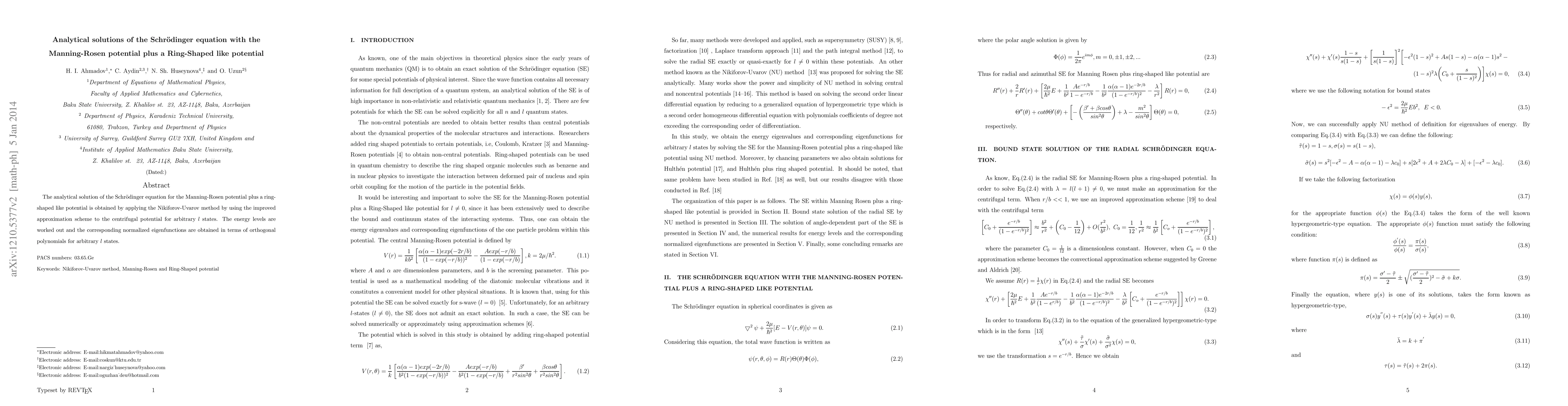 The paper presents analytical solutions for the Schrödinger equation combining the Manning-Rosen and ring-shaped potentials using the Nikiforov-Uvarov method, yielding energy levels and normalized eigenfunctions expressed in orthogonal polynomials for arbitrary $l$ states.