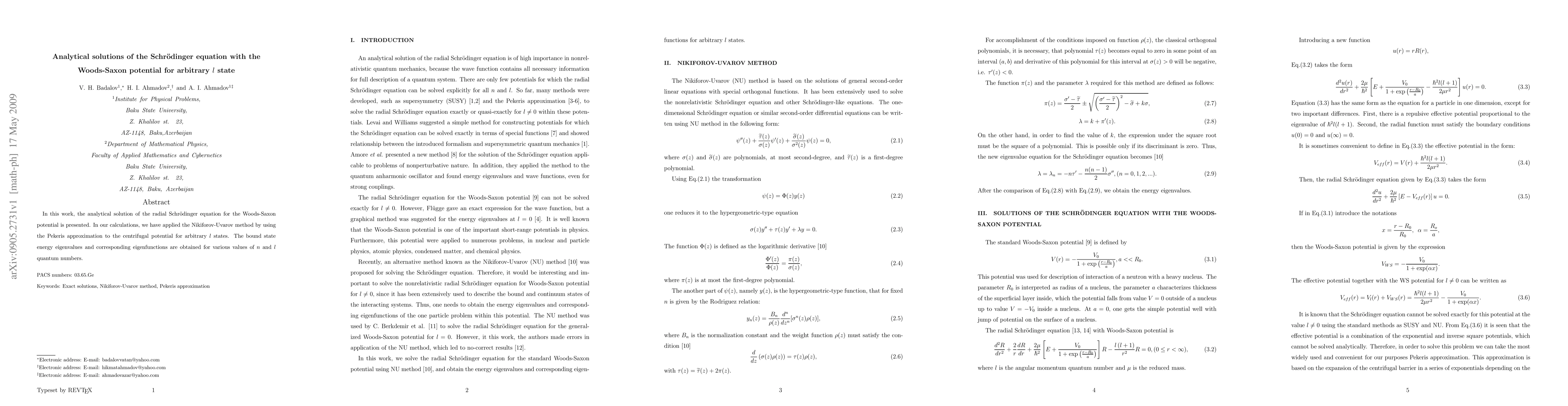 This paper presents an analytical solution for the radial Schrödinger equation with the Woods-Saxon potential, employing the Nikiforov-Uvarov method and the Pekeris approximation for arbitrary $l$ states. It derives bound state energy eigenvalues and eigenfunctions for various $n$ and $l$ quantum numbers.